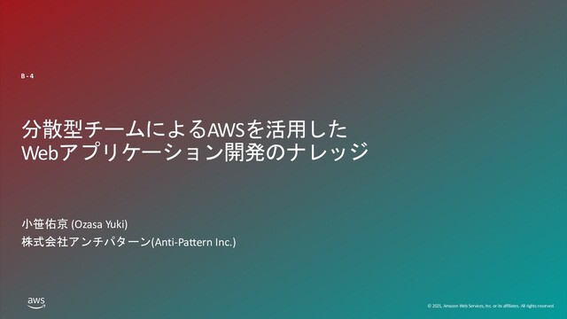 rights reserved. 分散型チームによるAWSを活用した Webアプリケーション開発のナレッジ 小笹佑京 (Ozasa Yuki) 株式会社アンチパターン(Anti-Pattern Inc.) B - 4