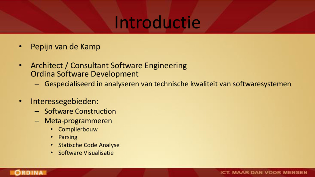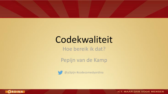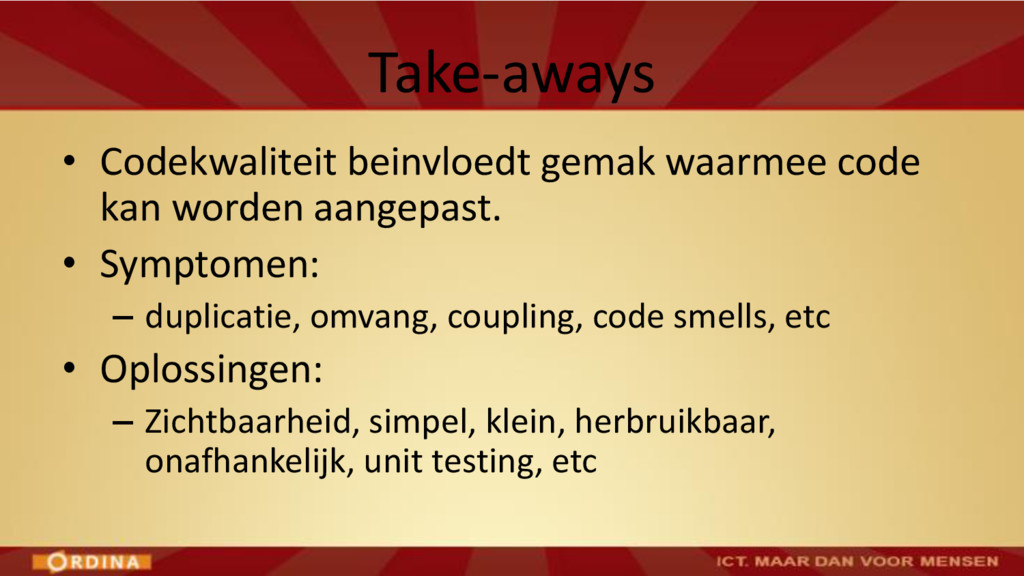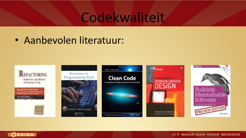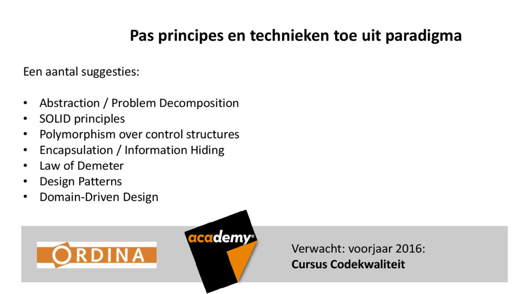 • Abstraction / Problem Decomposition • SOLID principles • Polymorphism over control structures • Encapsulation / Information Hiding • Law of Demeter • Design Patterns • Domain-Driven Design Verwacht: voorjaar 2016: Cursus Codekwaliteit