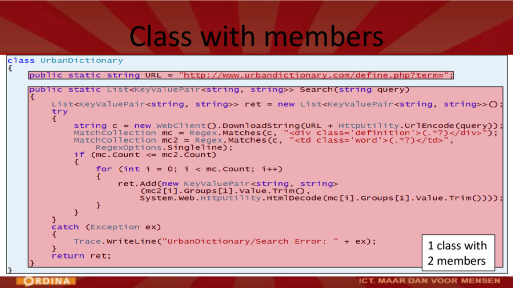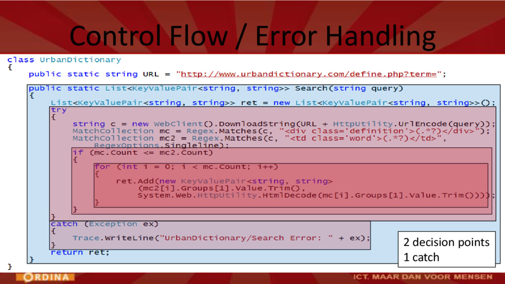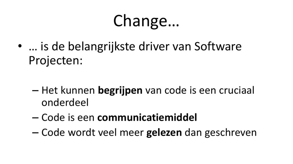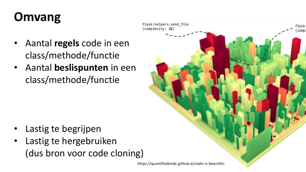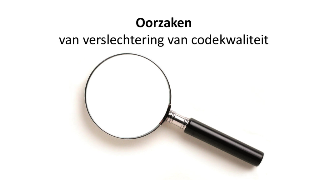 – Aanzienlijke omvang en complexiteit • Grote classes / methodes (veel regels code) • Complexe methodes (veel beslispunten) – Afhankelijkheid • Verwijzingen naar andere modules/classes Oorzaken van verslechtering van codekwaliteit