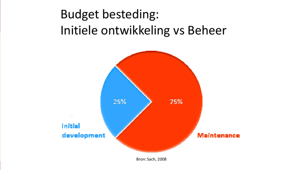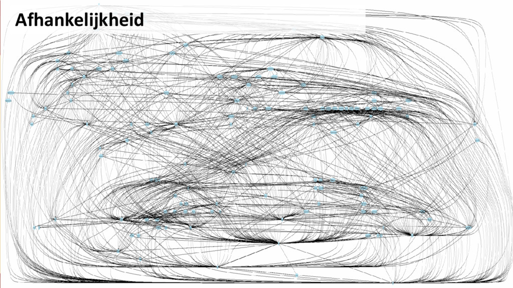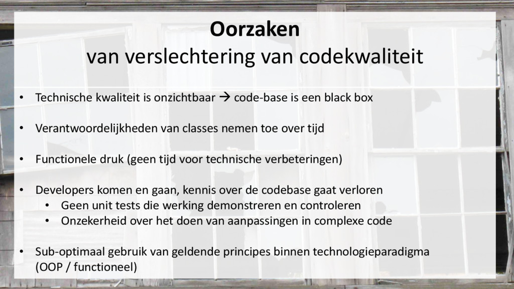 code-base is een black box • Verantwoordelijkheden van classes nemen toe over tijd • Functionele druk (geen tijd voor technische verbeteringen) • Developers komen en gaan, kennis over de codebase gaat verloren • Geen unit tests die werking demonstreren en controleren • Onzekerheid over het doen van aanpassingen in complexe code • Sub-optimaal gebruik van geldende principes binnen technologieparadigma (OOP / functioneel)