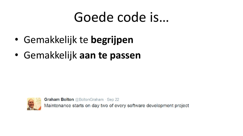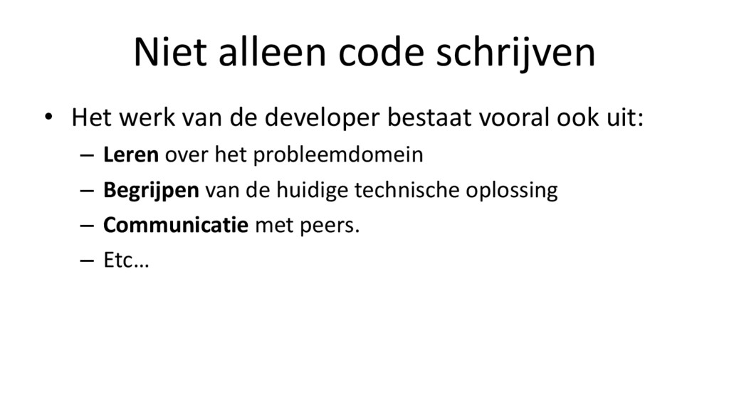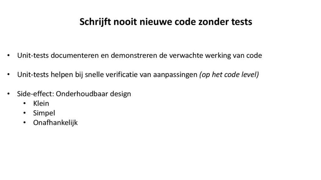 demonstreren de verwachte werking van code • Unit-tests helpen bij snelle verificatie van aanpassingen (op het code level) • Side-effect: Onderhoudbaar design • Klein • Simpel • Onafhankelijk