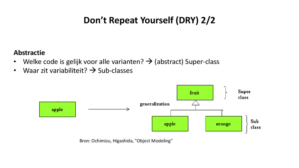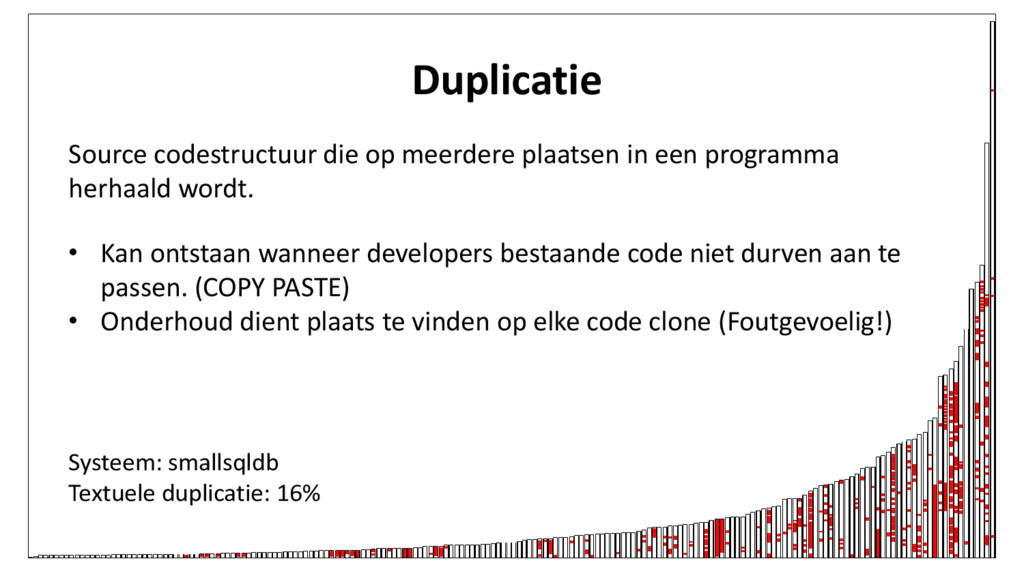 meerdere plaatsen in een programma herhaald wordt. • Kan ontstaan wanneer developers bestaande code niet durven aan te passen. (COPY PASTE) • Onderhoud dient plaats te vinden op elke code clone (Foutgevoelig!)