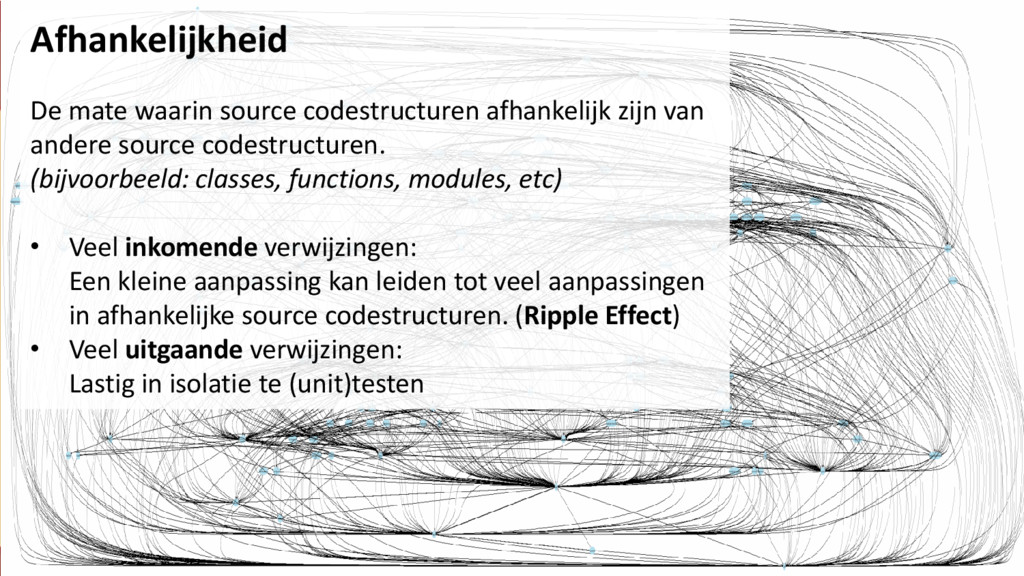 source codestructuren. (bijvoorbeeld: classes, functions, modules, etc) • Veel inkomende verwijzingen: Een kleine aanpassing kan leiden tot veel aanpassingen in afhankelijke source codestructuren. (Ripple Effect) • Veel uitgaande verwijzingen: Lastig in isolatie te (unit)testen