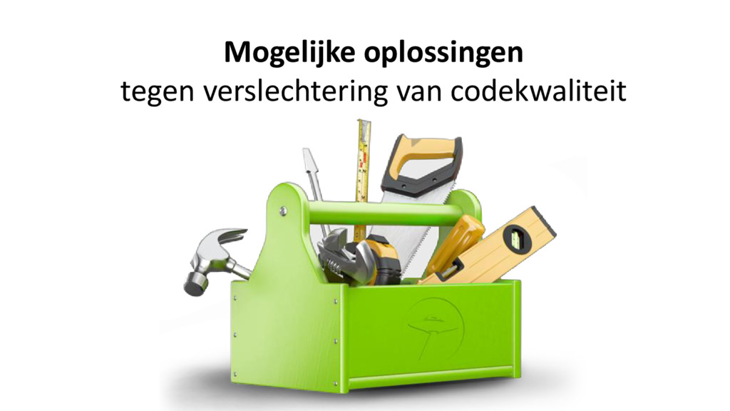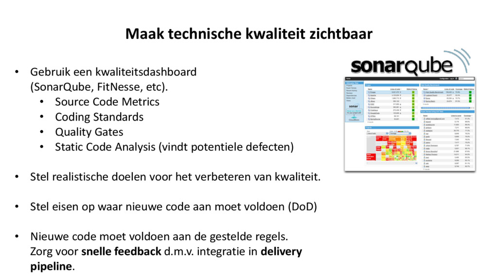 etc). • Source Code Metrics • Coding Standards • Quality Gates • Static Code Analysis (vindt potentiele defecten) • Stel realistische doelen voor het verbeteren van kwaliteit. • Stel eisen op waar nieuwe code aan moet voldoen (DoD) • Nieuwe code moet voldoen aan de gestelde regels. Zorg voor snelle feedback d.m.v. integratie in delivery pipeline.
