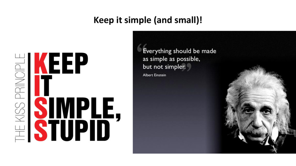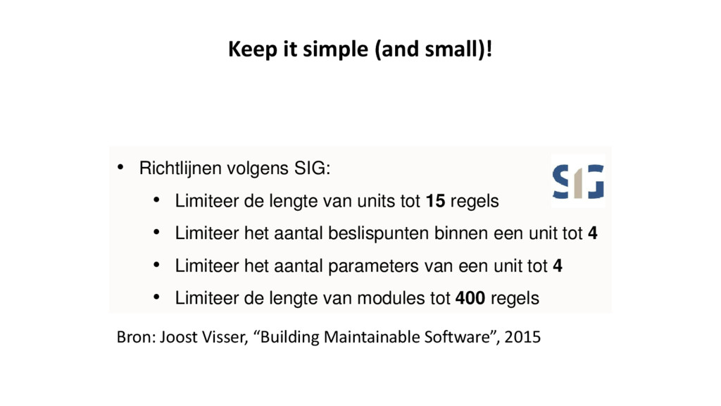 tot 15 regels • Limiteer het aantal beslispunten binnen een unit tot 4 • Limiteer het aantal parameters van een unit tot 4 • Limiteer de lengte van modules tot 400 regels Bron: Joost Visser, “Building Maintainable Software”, 2015 Keep it simple (and small)!