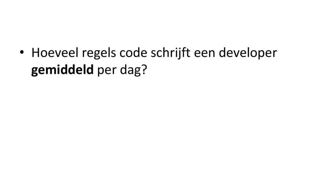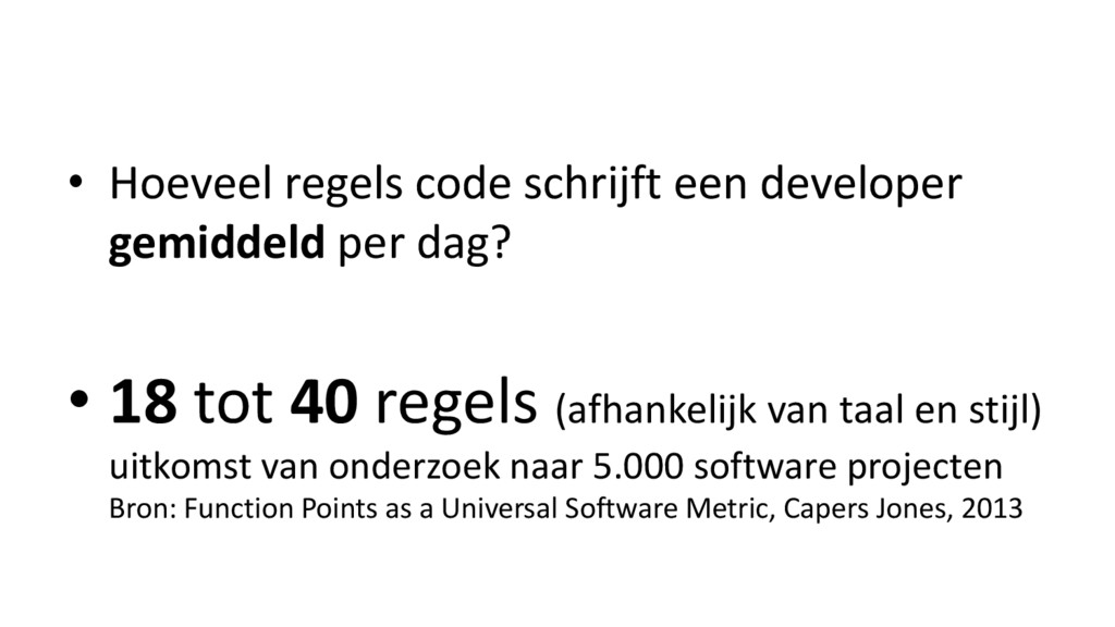 • 18 tot 40 regels (afhankelijk van taal en stijl) uitkomst van onderzoek naar 5.000 software projecten Bron: Function Points as a Universal Software Metric, Capers Jones, 2013