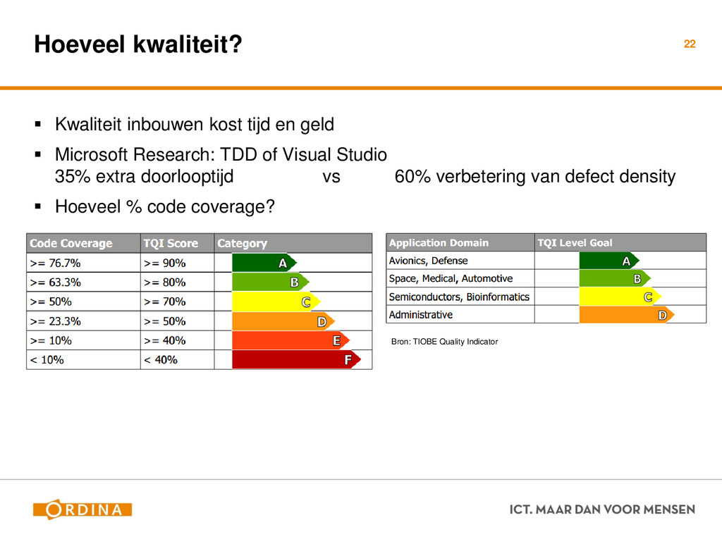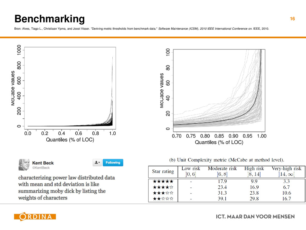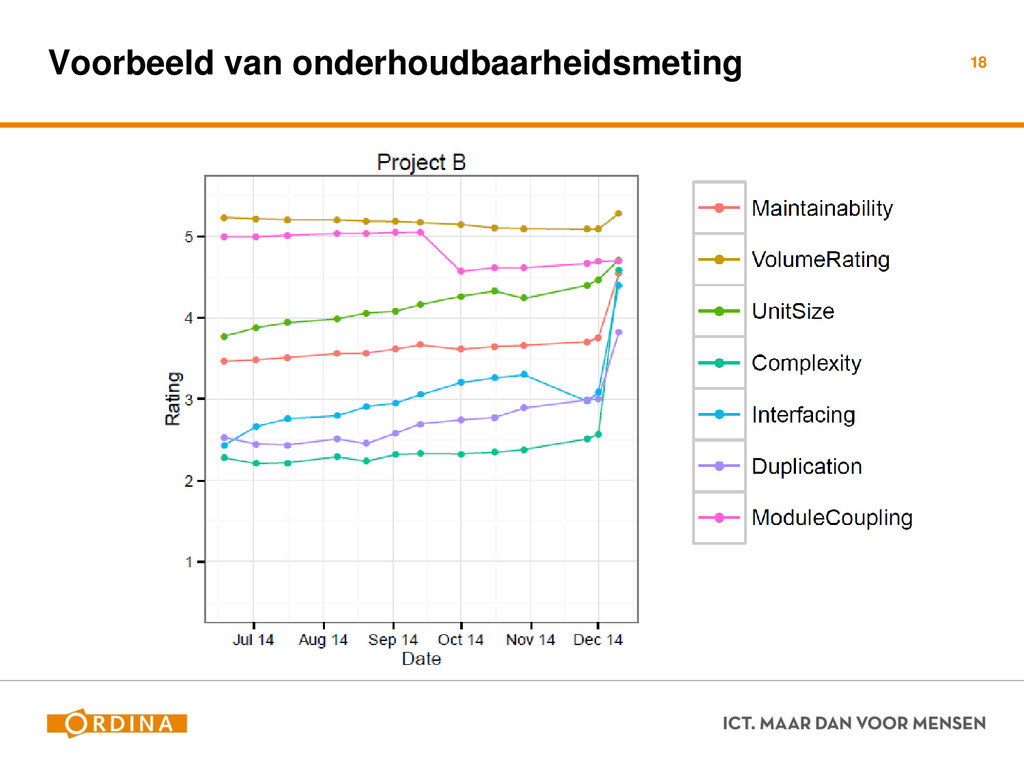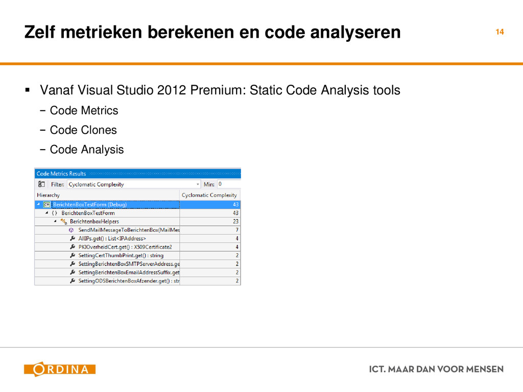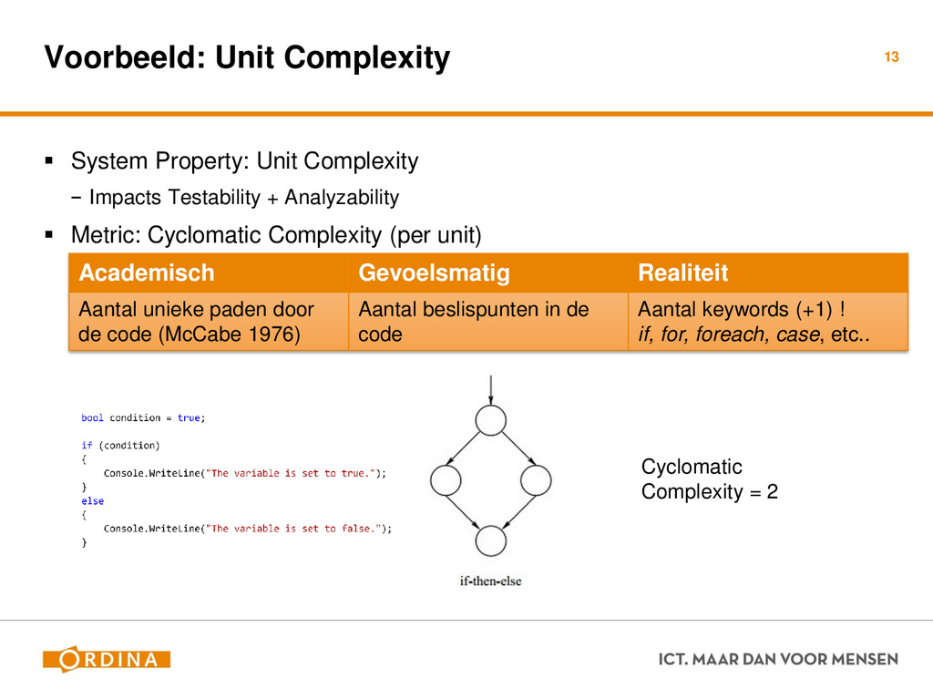 Testability + Analyzability Metric: Cyclomatic Complexity (per unit) 13 Academisch Gevoelsmatig Realiteit Aantal unieke paden door de code (McCabe 1976) Aantal beslispunten in de code Aantal keywords (+1) ! if, for, foreach, case, etc.. Cyclomatic Complexity = 2