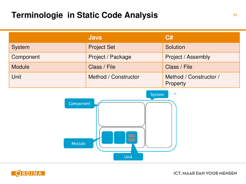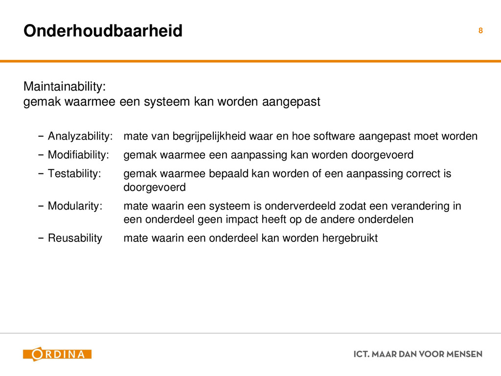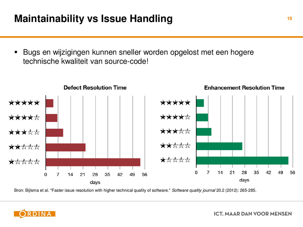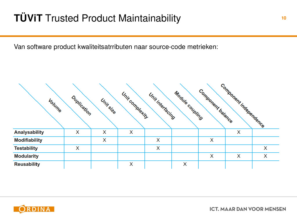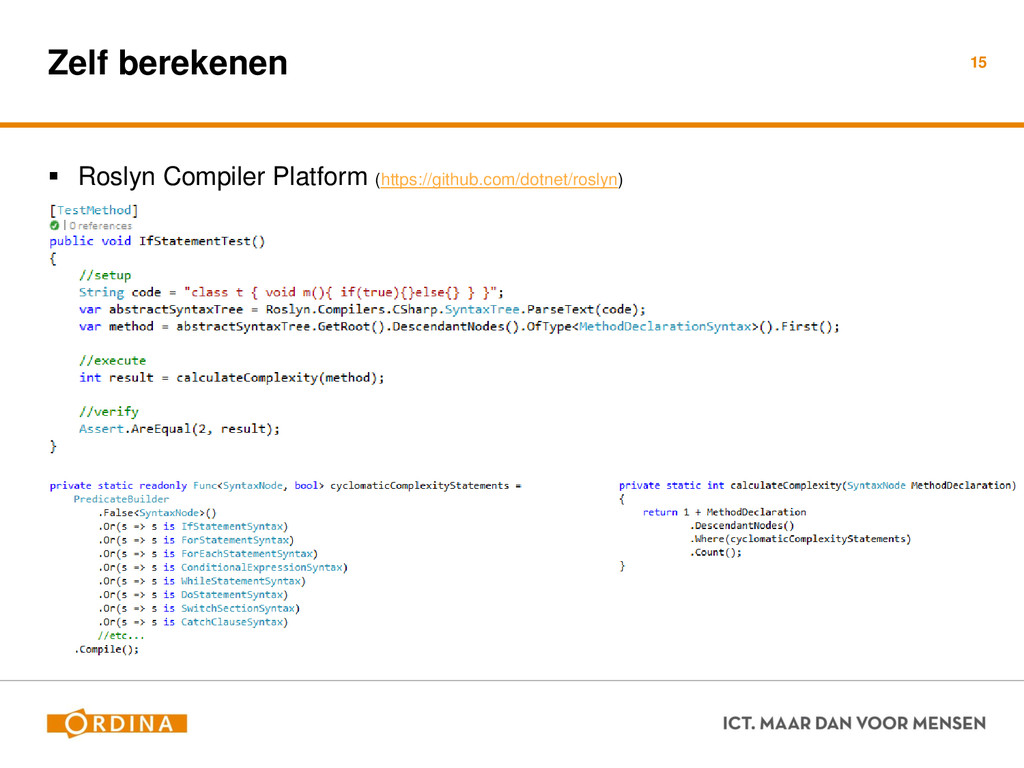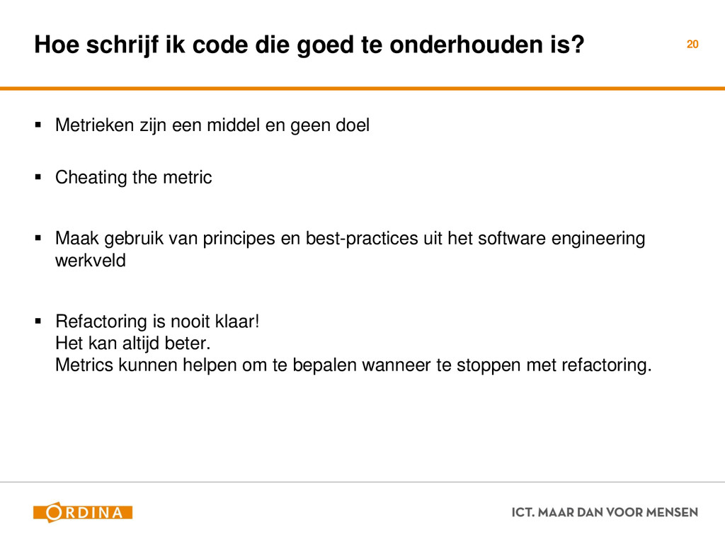 Testability + Analyzability Metric: Cyclomatic Complexity (per unit) 13 Academisch Gevoelsmatig Realiteit Aantal unieke paden door de code (McCabe 1976) Aantal beslispunten in de code Aantal keywords (+1) ! if, for, foreach, case, etc.. Cyclomatic Complexity = 2