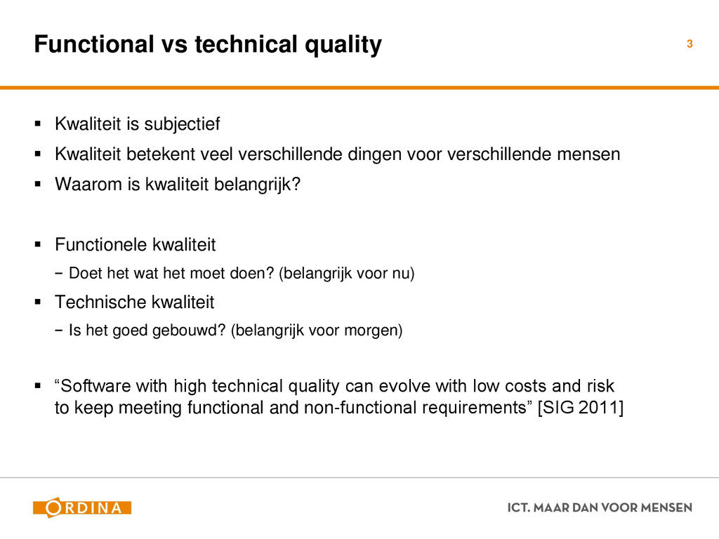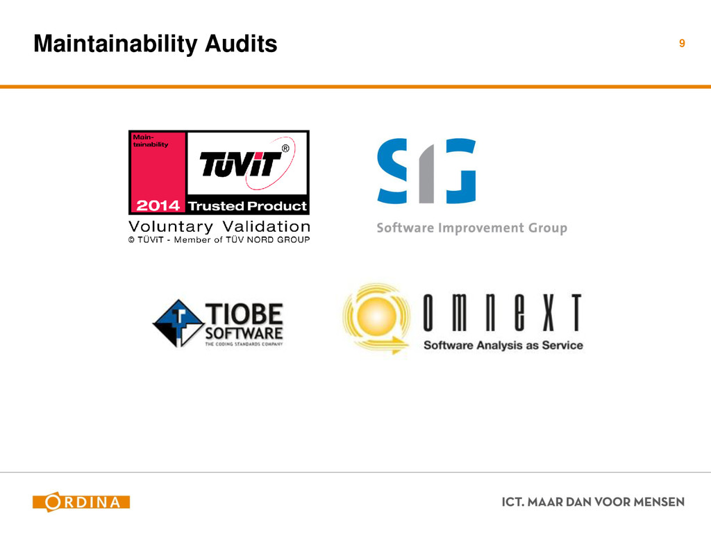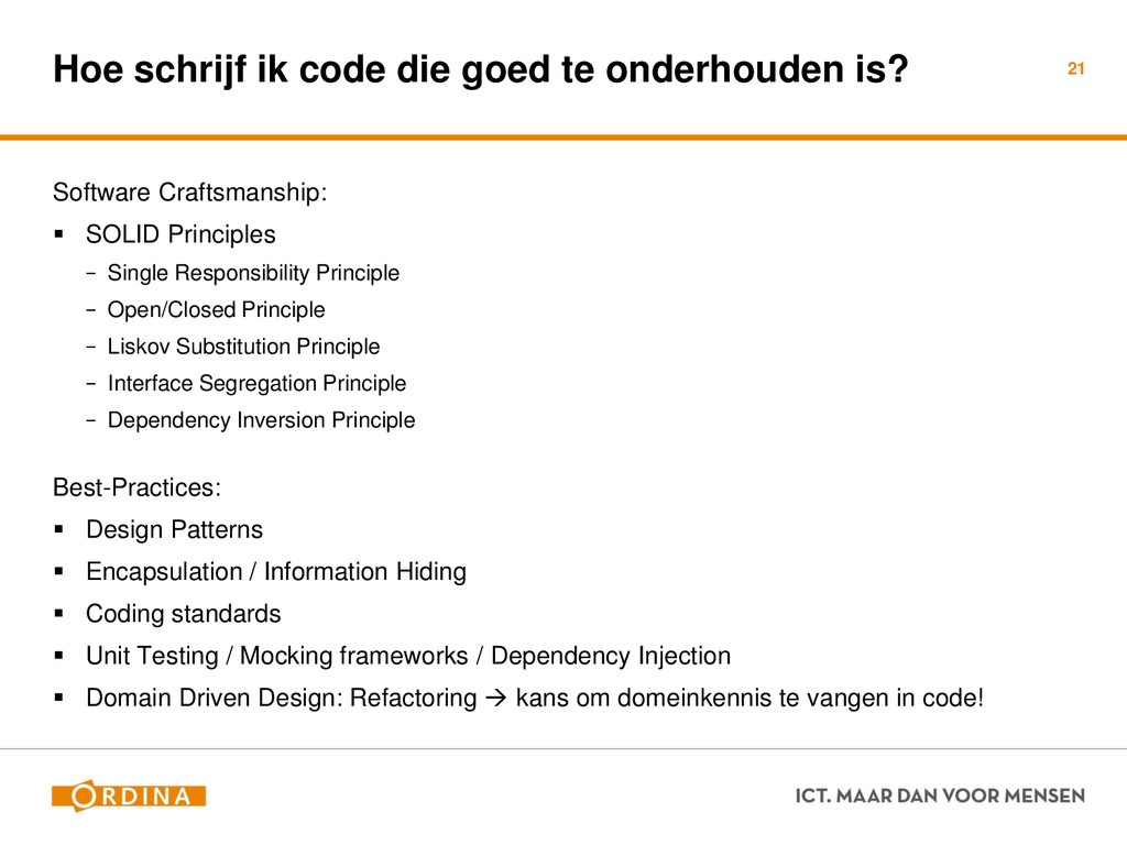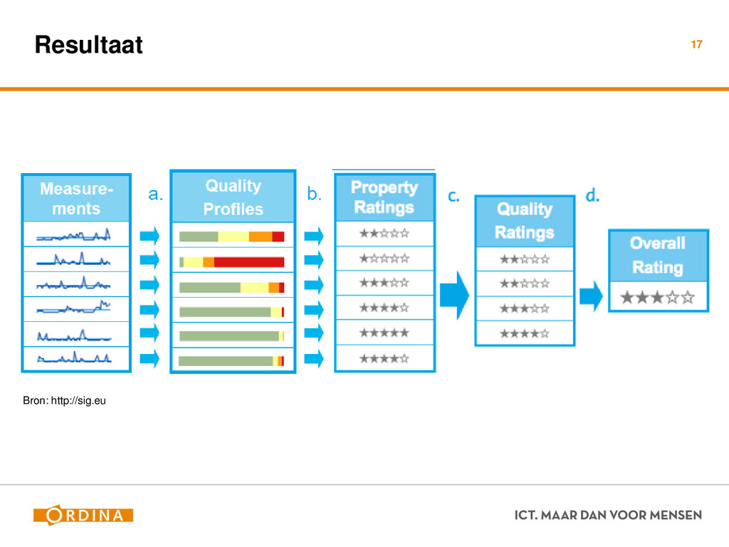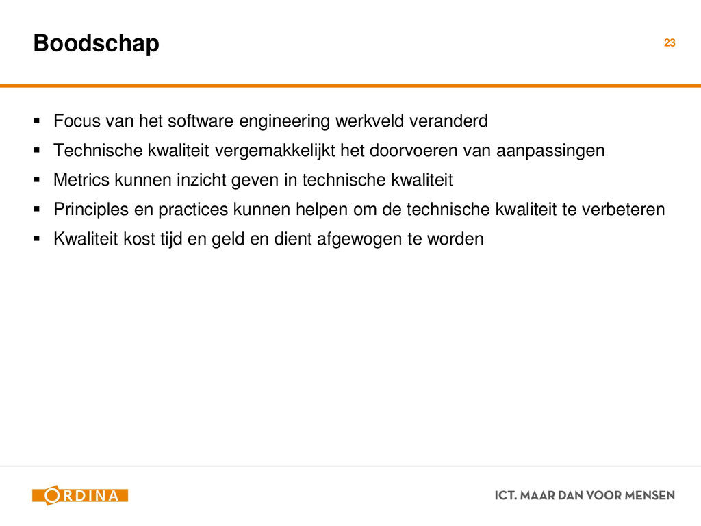 Testability + Analyzability Metric: Cyclomatic Complexity (per unit) 13 Academisch Gevoelsmatig Realiteit Aantal unieke paden door de code (McCabe 1976) Aantal beslispunten in de code Aantal keywords (+1) ! if, for, foreach, case, etc.. Cyclomatic Complexity = 2