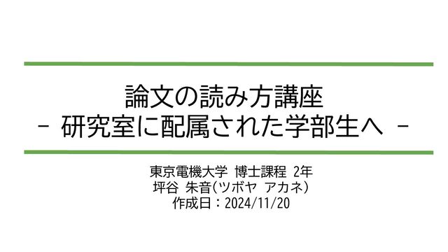 私(D2)が学部生(B3)に対して実施した「論文の読み方講座」のスライドです。指導教員に論文を読むように言われたが、いまいち読めた気にならない学生を対象にしています。またそのような学生を指導する人々の参考にもなるかもしれません。この講座は毎年、所属研究室内でおこなっているものなので、1年に1回内容がアップデートする可能性があります。