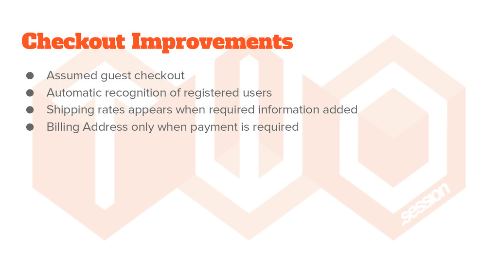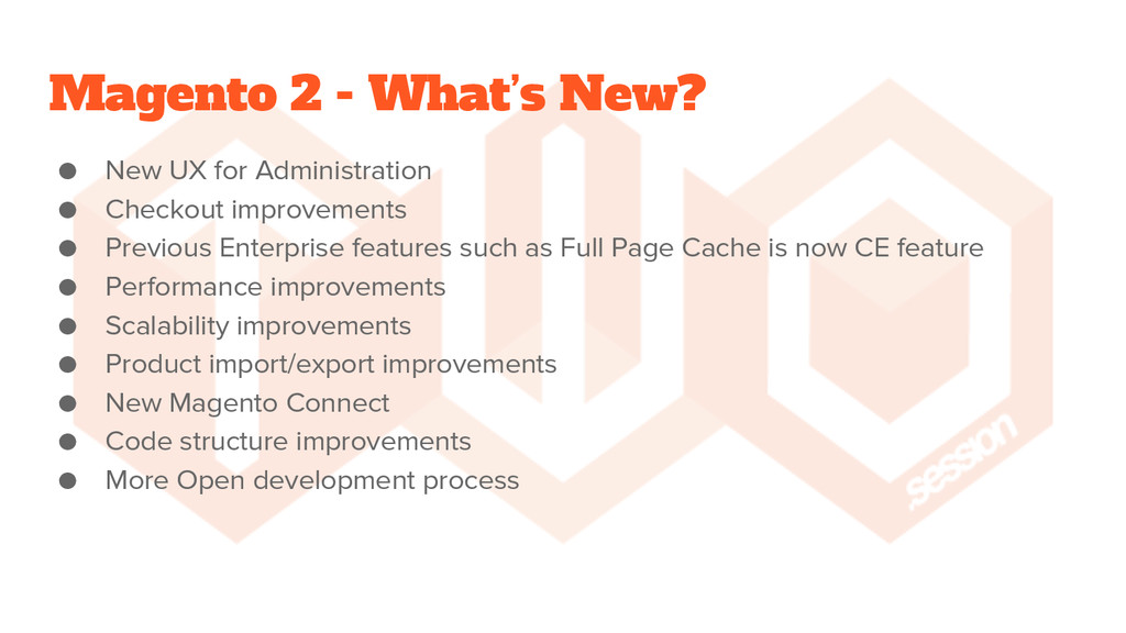 • Checkout improvements • Previous Enterprise features such as Full Page Cache is now CE feature • Performance improvements • Scalability improvements • Product import/export improvements • New Magento Connect • Code structure improvements • More Open development process