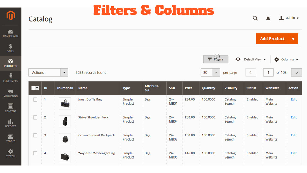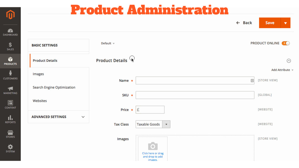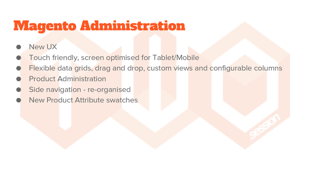 for Tablet/Mobile • Flexible data grids, drag and drop, custom views and configurable columns • Product Administration • Side navigation - re-organised • New Product Attribute swatches