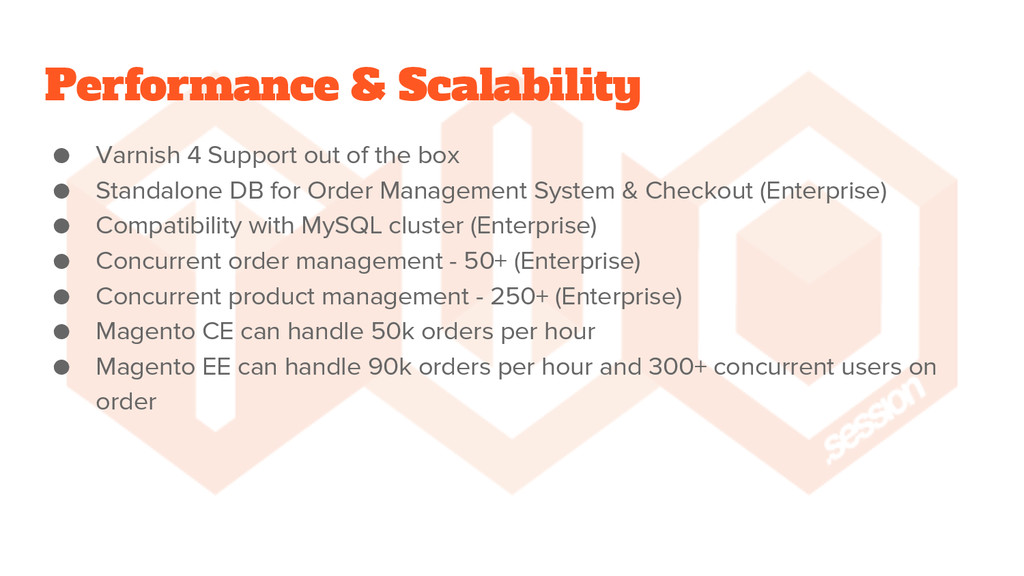 box • Standalone DB for Order Management System & Checkout (Enterprise) • Compatibility with MySQL cluster (Enterprise) • Concurrent order management - 50+ (Enterprise) • Concurrent product management - 250+ (Enterprise) • Magento CE can handle 50k orders per hour • Magento EE can handle 90k orders per hour and 300+ concurrent users on order
