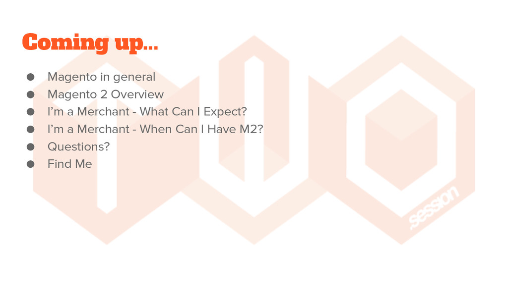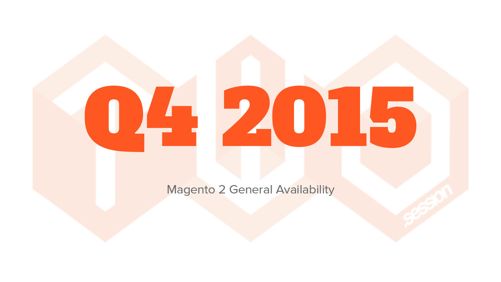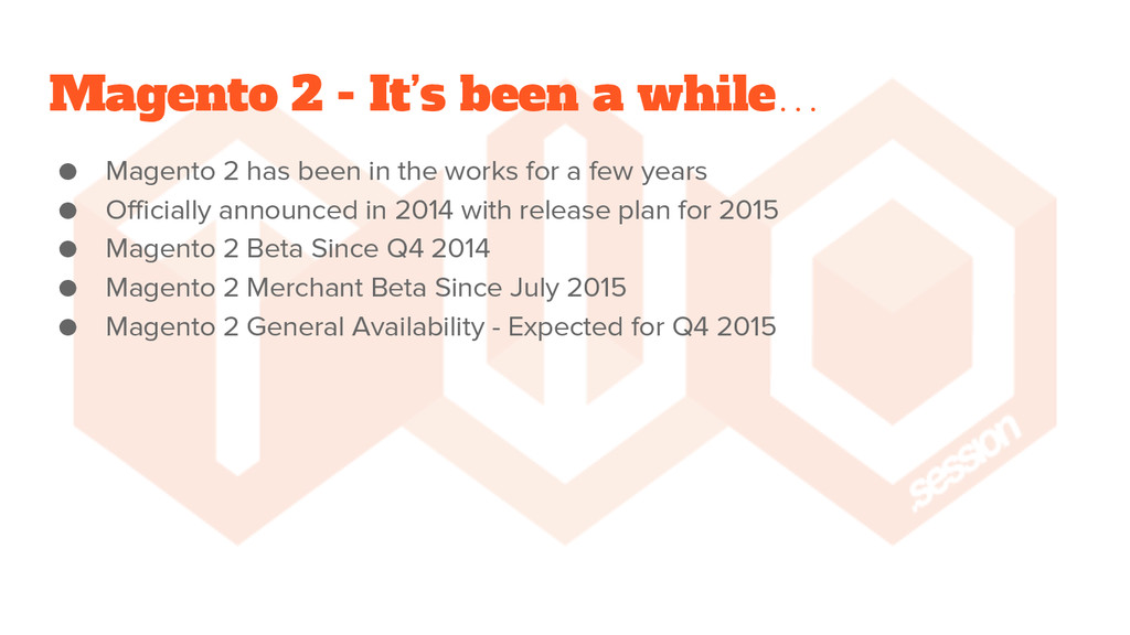 has been in the works for a few years • Officially announced in 2014 with release plan for 2015 • Magento 2 Beta Since Q4 2014 • Magento 2 Merchant Beta Since July 2015 • Magento 2 General Availability - Expected for Q4 2015