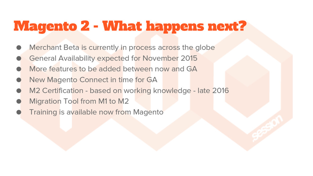 currently in process across the globe • General Availability expected for November 2015 • More features to be added between now and GA • New Magento Connect in time for GA • M2 Certification - based on working knowledge - late 2016 • Migration Tool from M1 to M2 • Training is available now from Magento