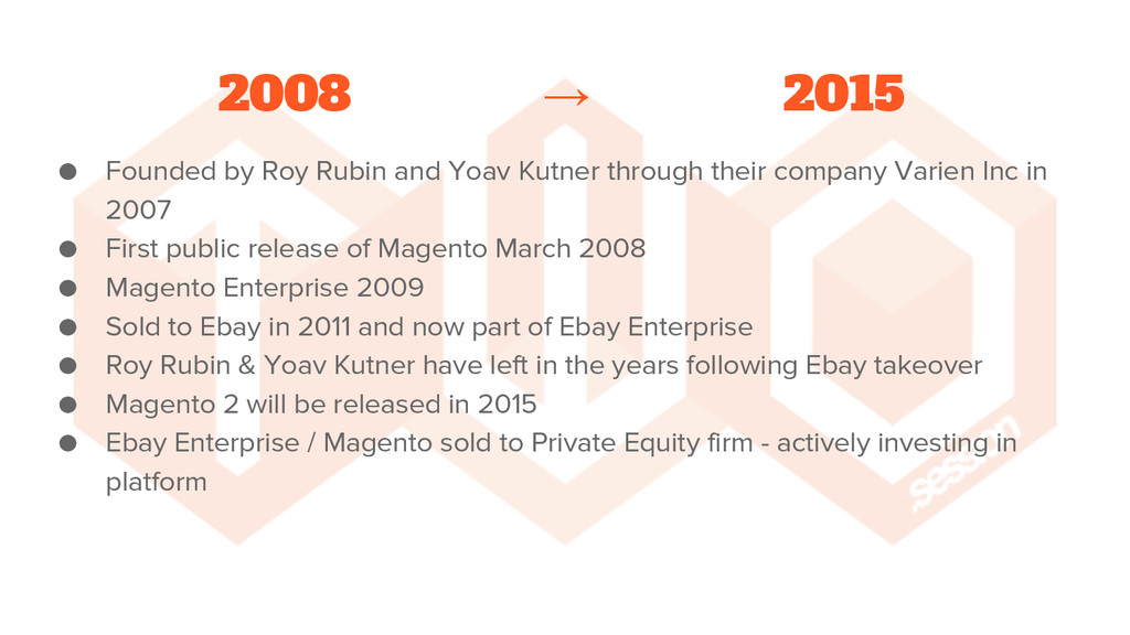 Kutner through their company Varien Inc in 2007 • First public release of Magento March 2008 • Magento Enterprise 2009 • Sold to Ebay in 2011 and now part of Ebay Enterprise • Roy Rubin & Yoav Kutner have left in the years following Ebay takeover • Magento 2 will be released in 2015 • Ebay Enterprise / Magento sold to Private Equity firm - actively investing in platform