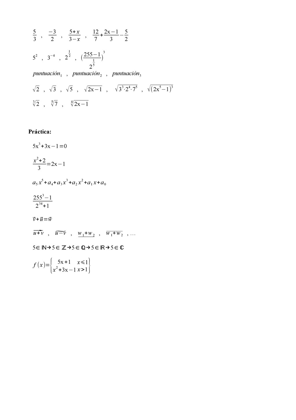 12 7 + 2x−1 3 − 5 2 52 , 3−4 , 2 1 2 , ( 255−1 2 1 5 ) 3 puntuación 1 , puntuación 2 , puntuación 3 √2 , √3 , √5 , √2x−1 , √33⋅24⋅75 , √(2x5−1)3 3 √2 , 5 √7 , 4 √2x−1 Práctica: 5x3+3x−1=0 x2+2 3 =2x−1 a 5 x5+a 4 +a 3 x3+a 2 x2+a 1 x+a 0 2553−1 234+1 ⃗ v+⃗ u=⃗ w ⃗ u+v , ̃ u−v , w 1 +w 2 , w 1 +w 2 , … 5∈ ℕ→5∈ ℤ→5∈ ℚ→5∈ ℝ→5∈ ℂ f (x)= { 5x+1 x2+3x−1 x⩽1 x>1 }