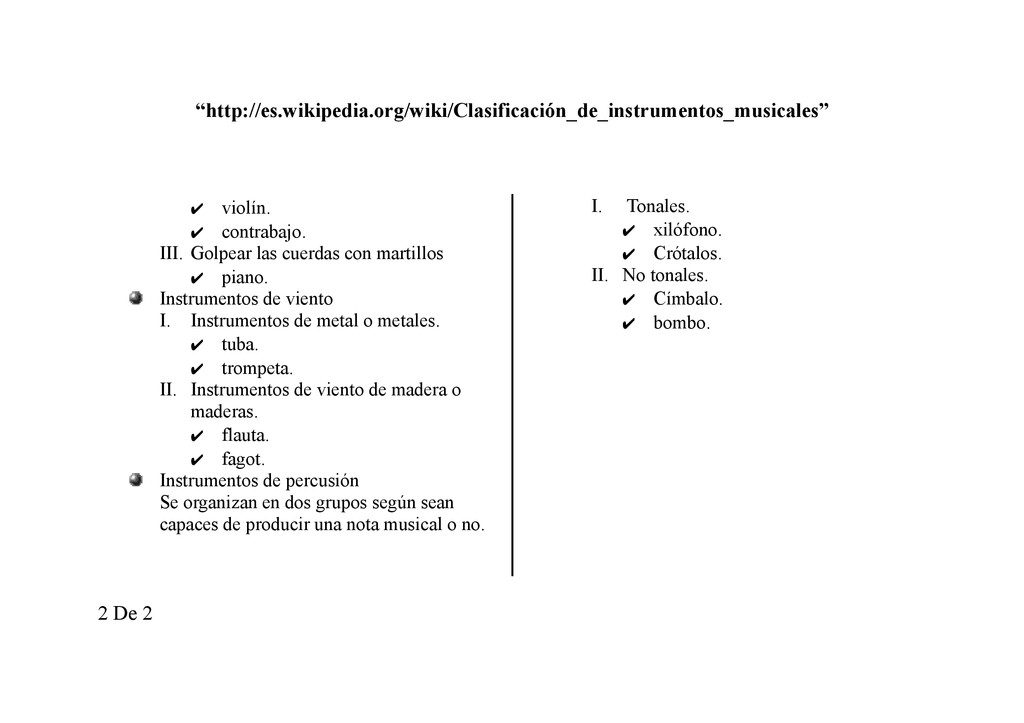 esta clasificación está dado por el elemento vibrante que produce el sonido. Por consiguiente, los instrumentos se clasifican en: E A) Cordófonos. El elemento vibrante es una cuerda. B) Aerófonos. El elemento vibrante es el aire. C) Membranófonos. El elementvibrante es una membrana. D) Ideófonos- El mismo instrumento es lo que vibra. E) Electrófonos . el sonido es creado o modificado mediante circuitos eléctricos. La clasificación clásica es (en el mismo orden): Instrumentos de cuerda: Los tres métodos más comunes para que un instrumento de cuerda produzca sonido son: I. Puntear con los dedos o con un plectro. ✔ guitarra. ✔ arpa. II. Deslizar un arco sobre las cuerdas para hacerlas vibrar. 1 De 2