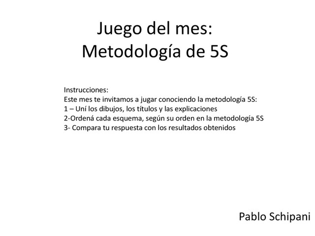 Pablo Schipani aquí compartió un PPT que explica el juego del mes, sobre la metodología 5S y sus soluciones. Este mes te invitamos a jugar conociendo la metodología 5s como unirse a dibujos, títulos y explicaciones etcetera.