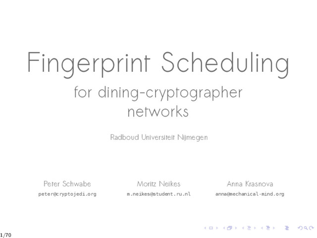 This talk explains Fingerprint scheduling, a scheduling algorithm for Dining Cryptographers networks, and outlines its characteristics compared to other scheduling algorithms.