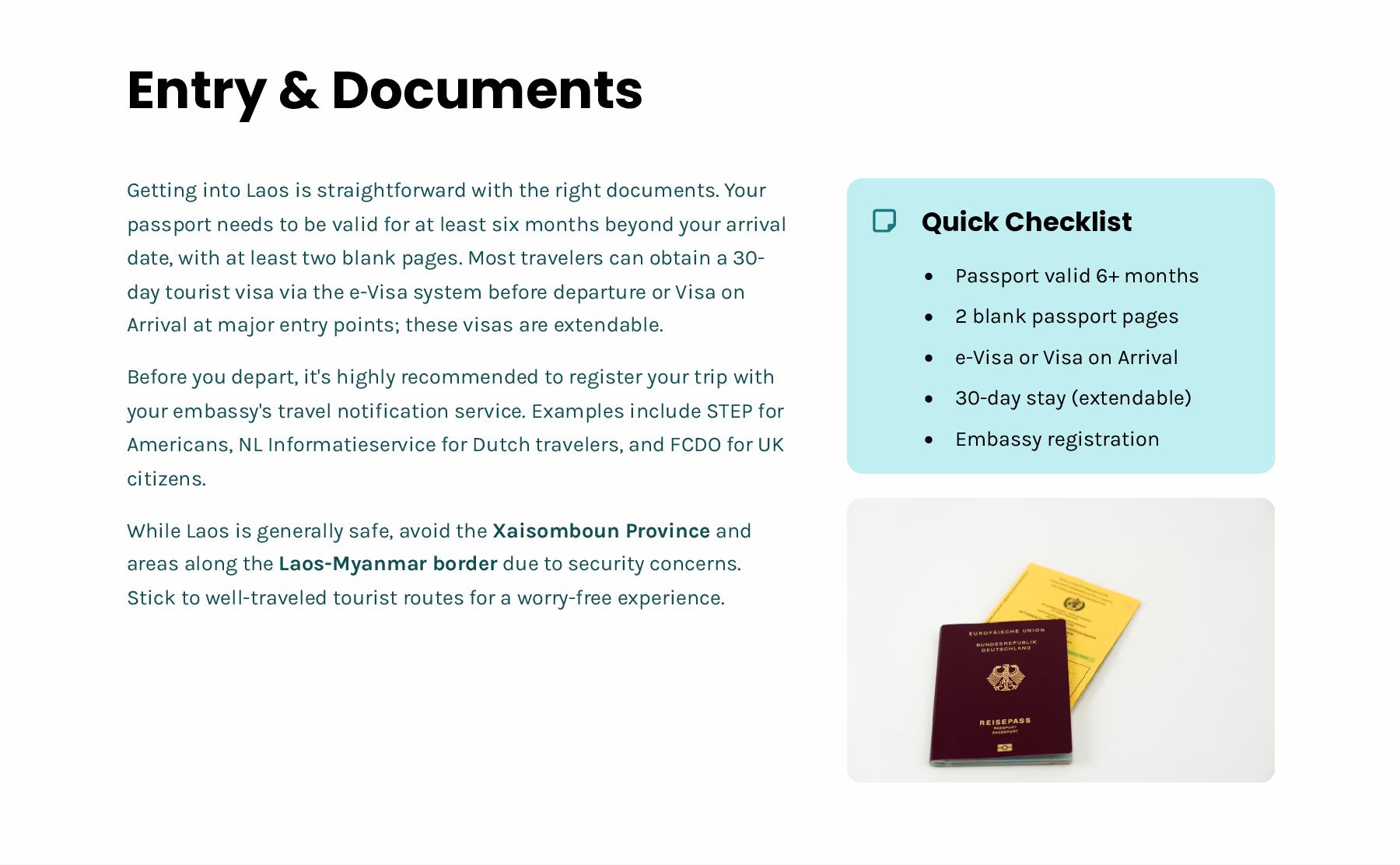 Visa & Entry – Passport validity rules, e-Visa and Visa on Arrival options, embassy registration tips, and areas to avoid for safety.