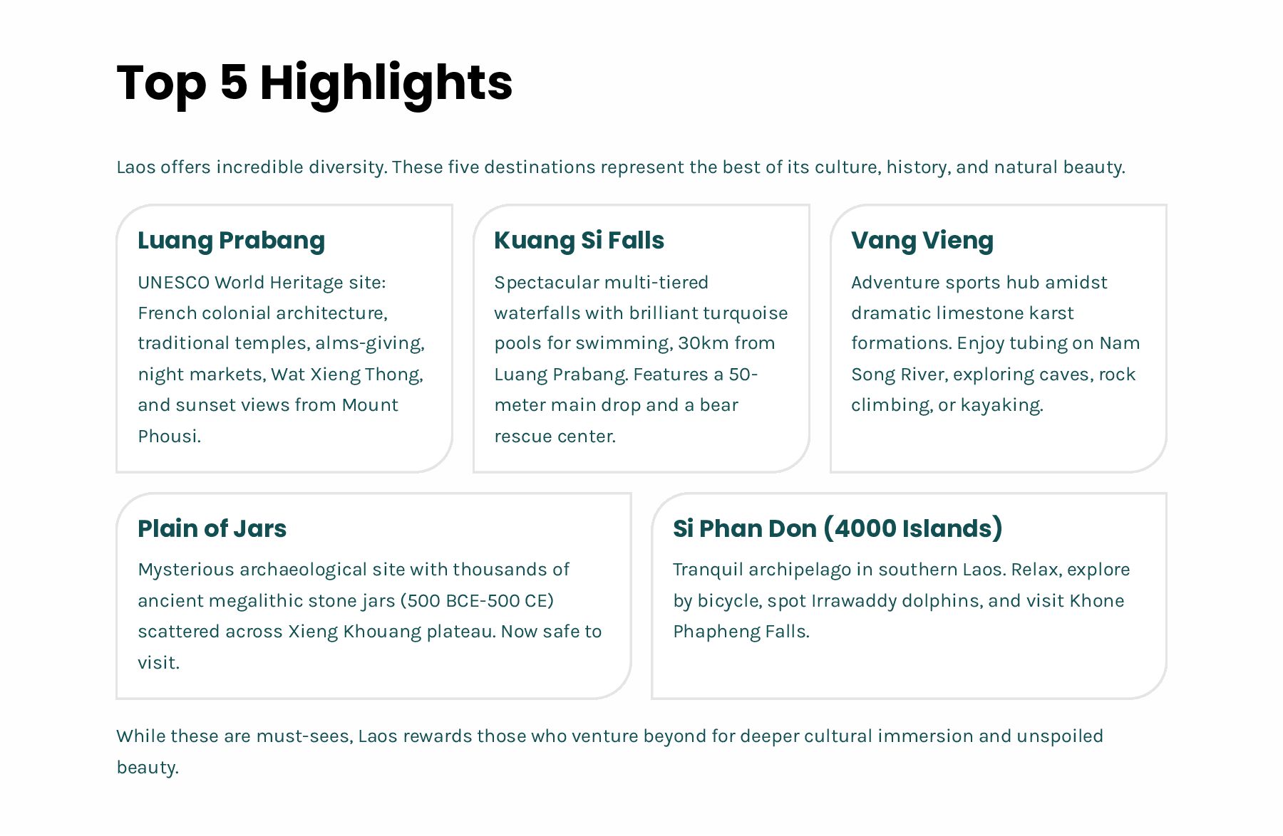 Top Highlights – Luang Prabang, Kuang Si Falls, Vang Vieng, the Plain of Jars, and Si Phan Don (4000 Islands).