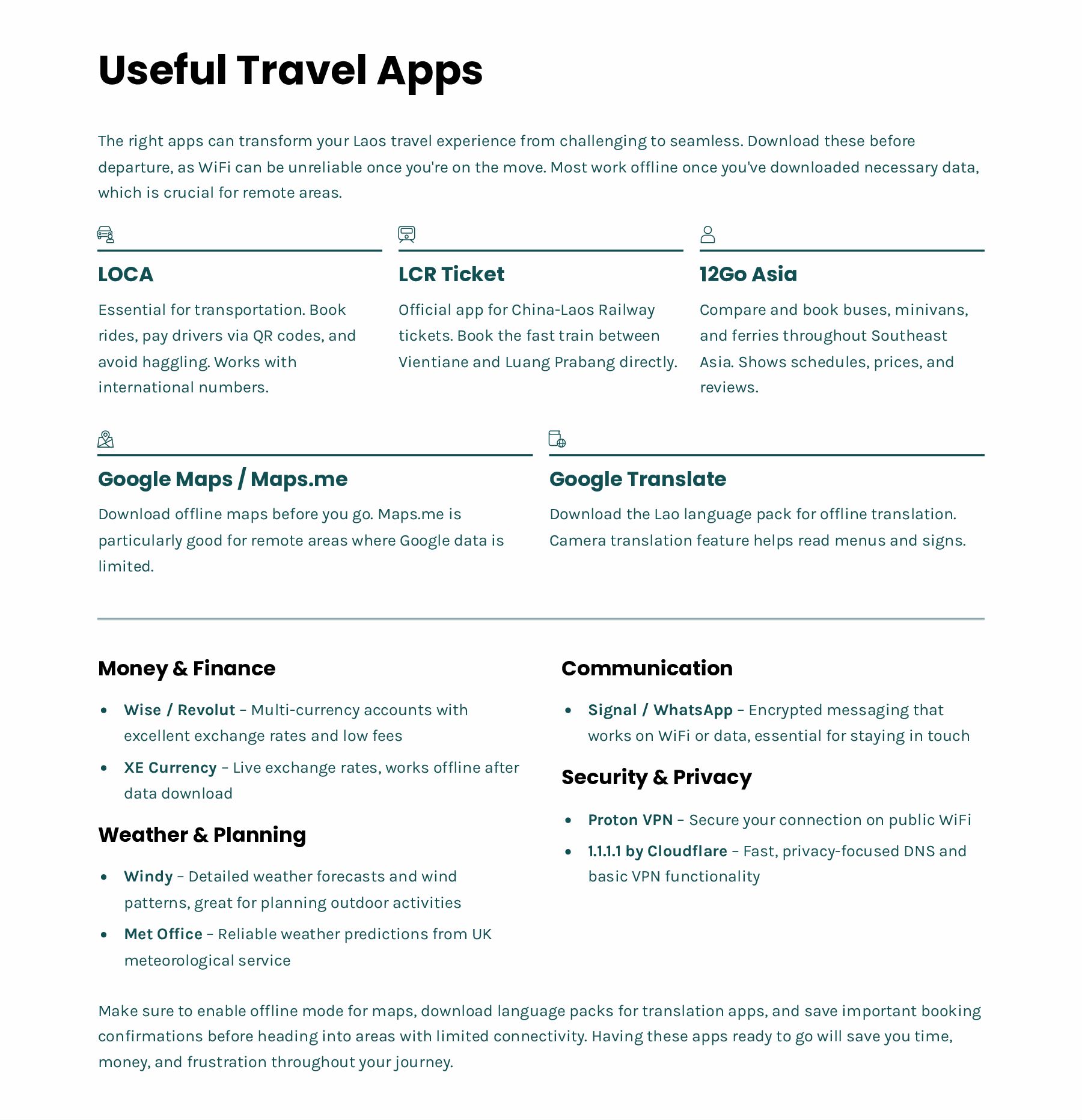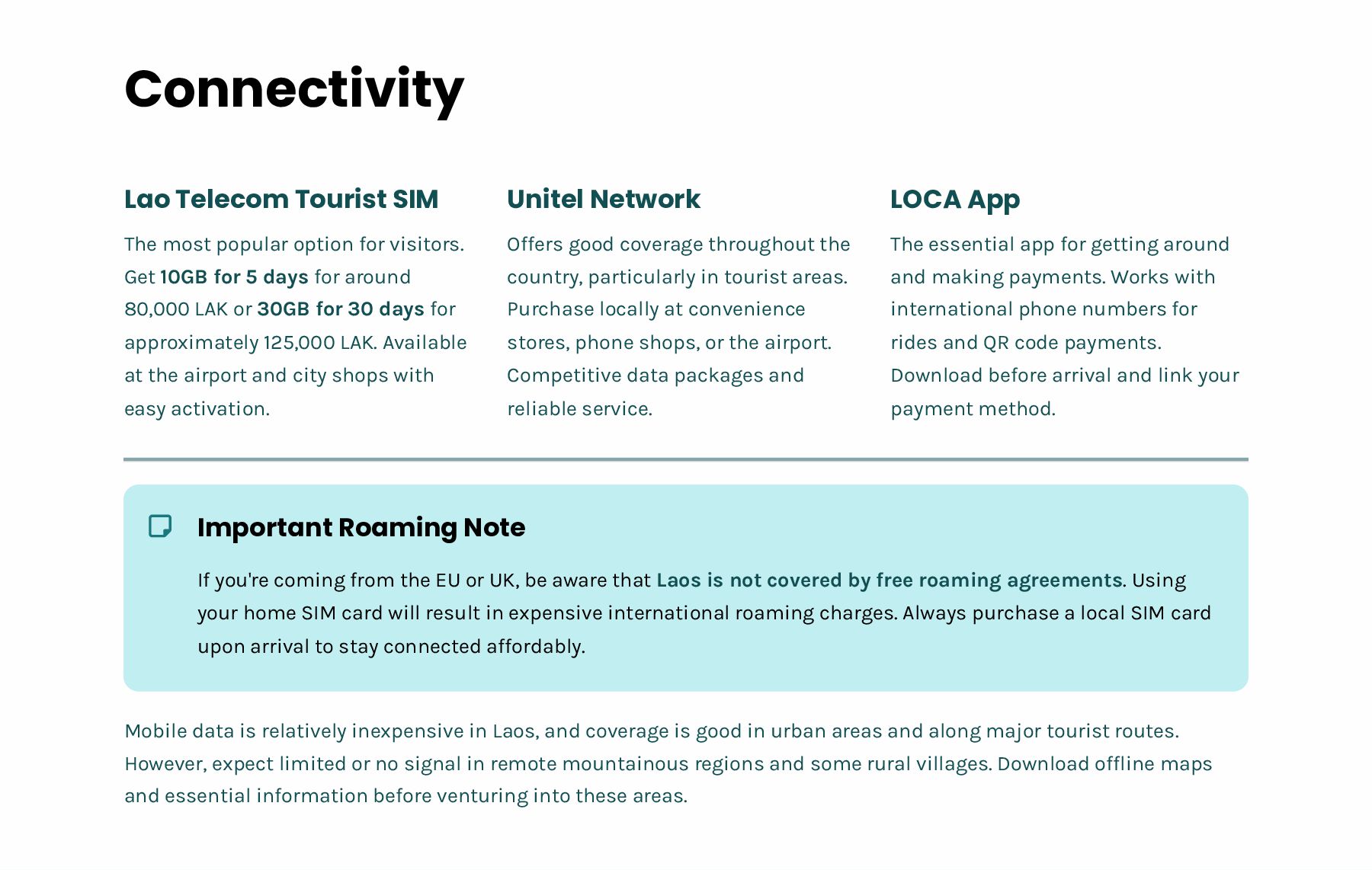 Connectivity – Best local SIM cards (Lao Telecom, Unitel), the LOCA ride-hailing and payment app, and offline tools for remote areas.