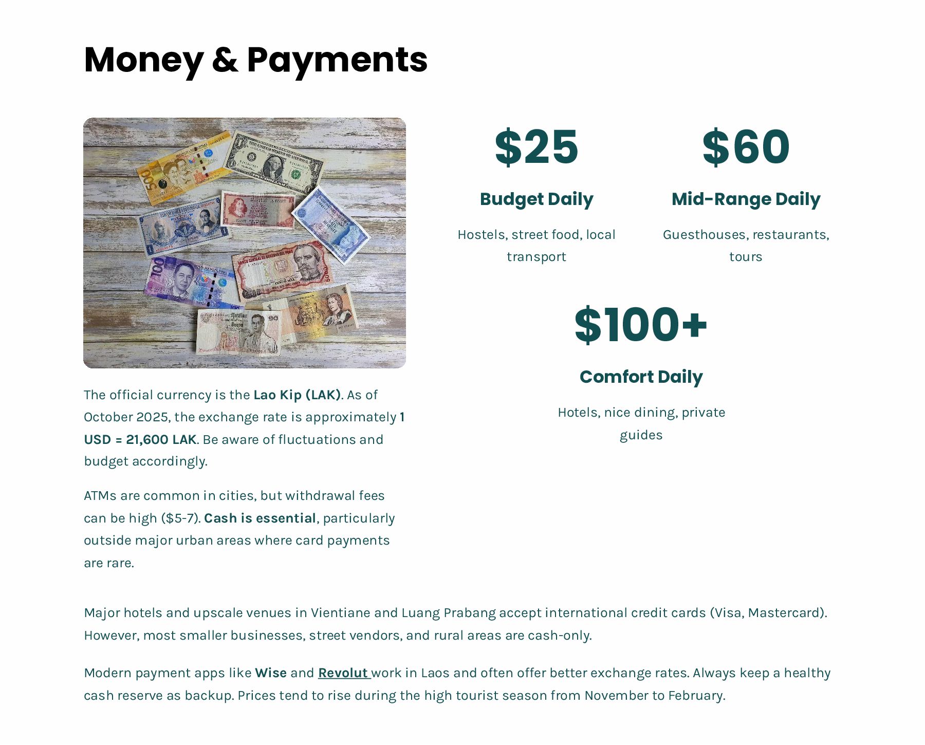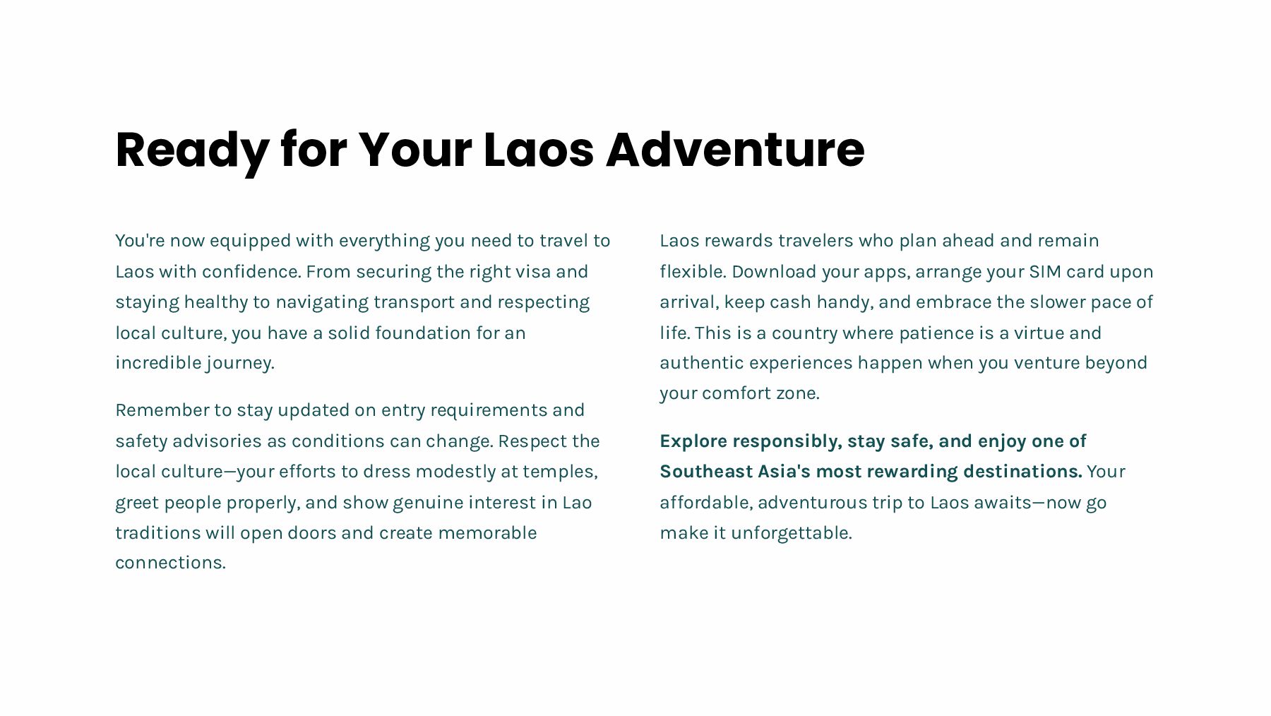 Whether you’re backpacking on a budget, traveling mid-range, or seeking a comfortable cultural adventure, this guide helps you plan smarter and explore Laos with ease and respect. Stay updated, travel safely, and enjoy one of Southeast Asia’s most rewarding destinations.
