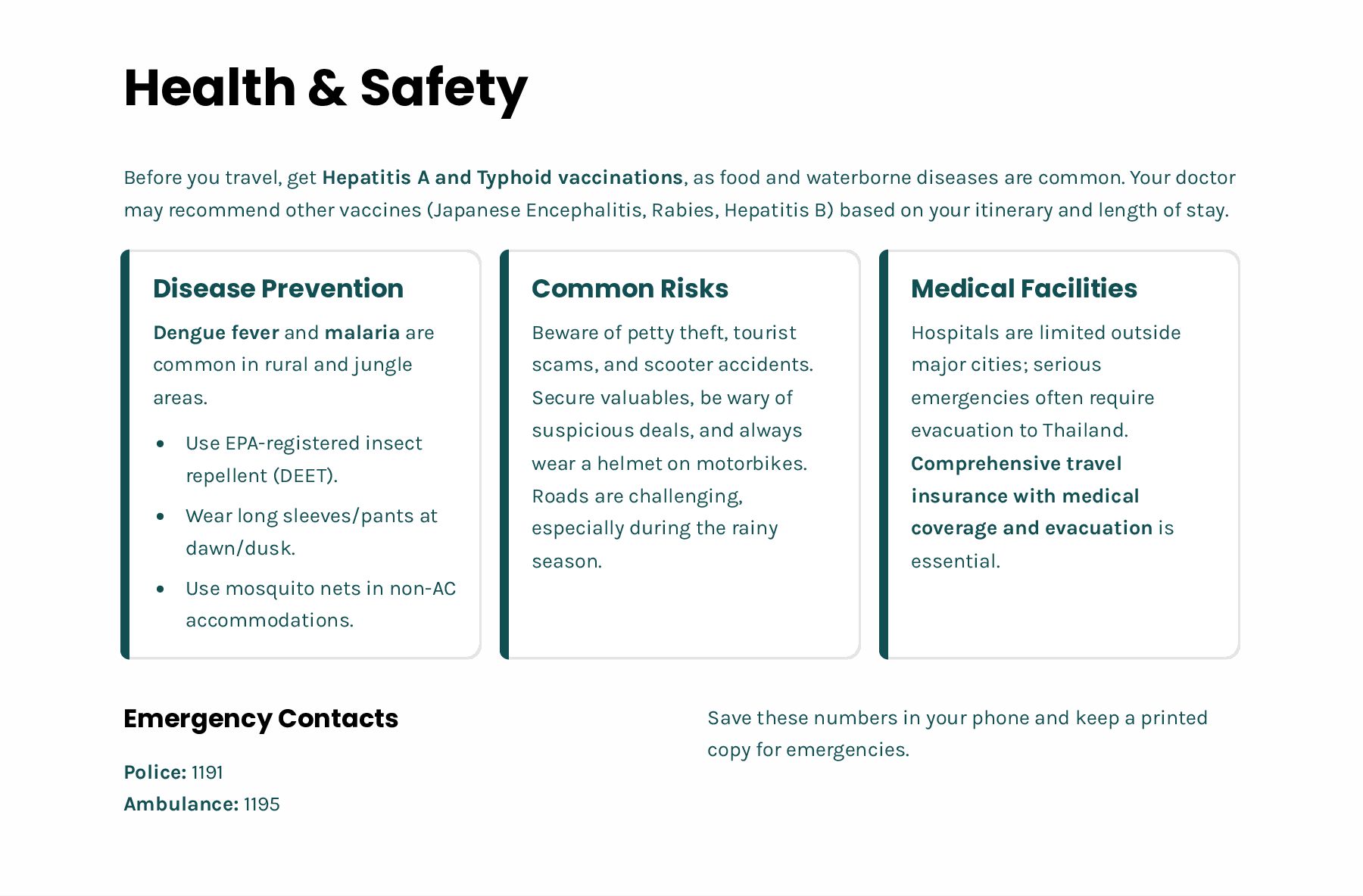 Health & Safety – Recommended vaccinations, how to prevent dengue and malaria, where to find medical care, and essential emergency contacts.