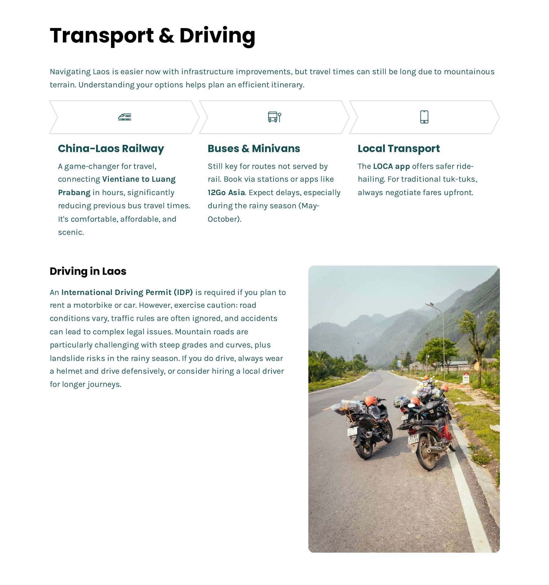 Transport & Driving – China-Laos Railway tips, buses and minivans, tuk-tuk negotiation, and driving safety with an International Driving Permit.