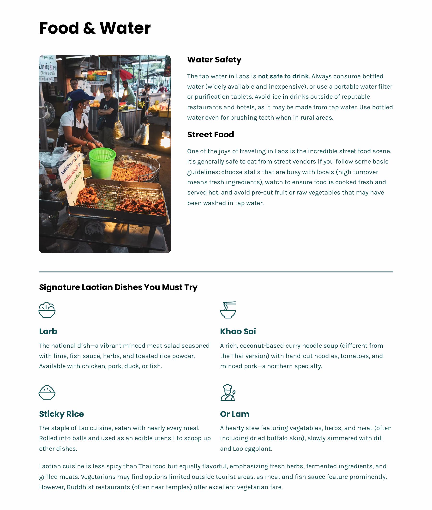 Food & Water Safety – How to enjoy street food safely, what to avoid, and must-try Laotian dishes like Larb, Khao Soi, and Sticky Rice.