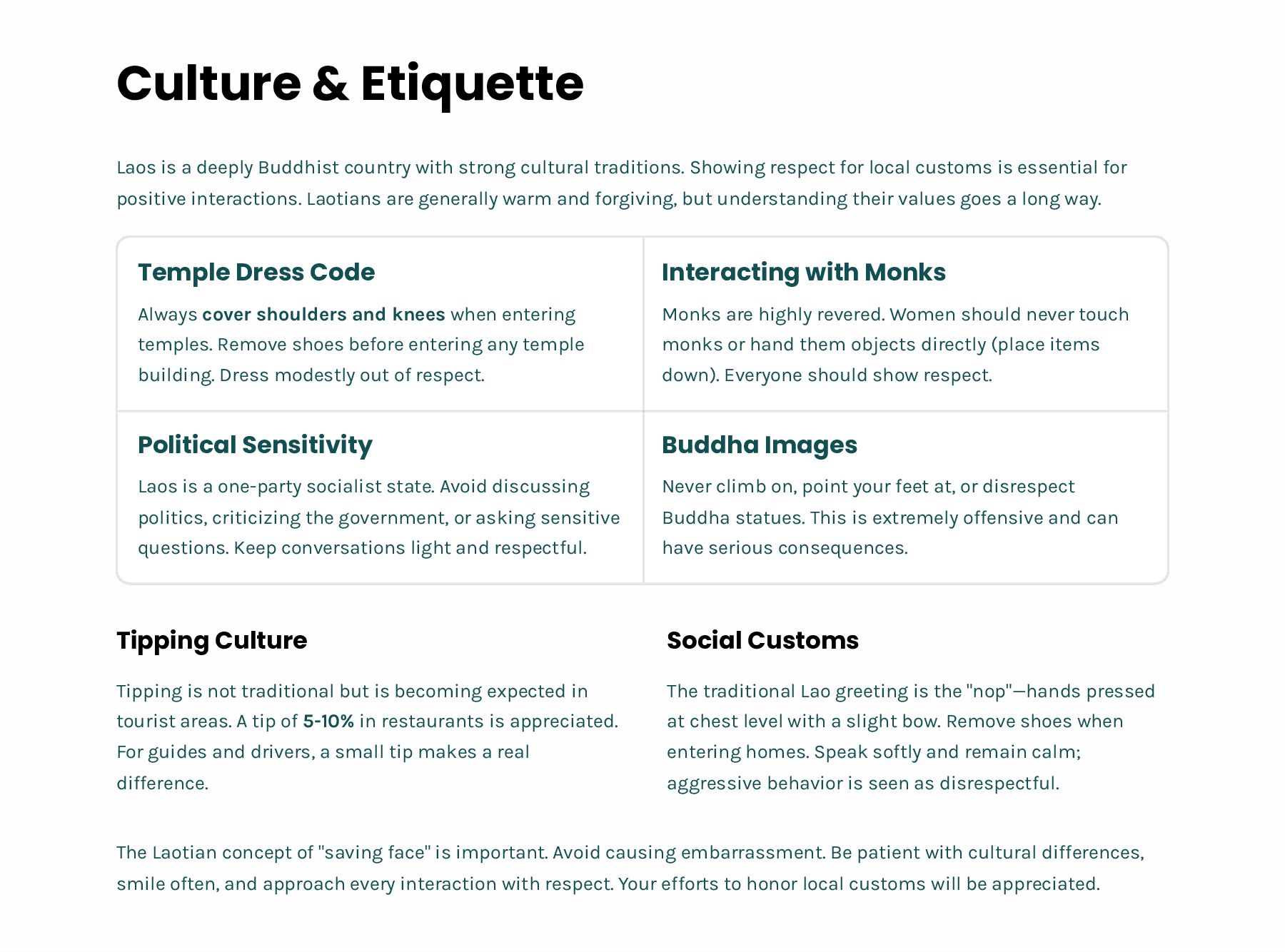 Culture & Etiquette – Temple dress codes, interacting with monks, political sensitivity, tipping practices, greetings, and social behavior.