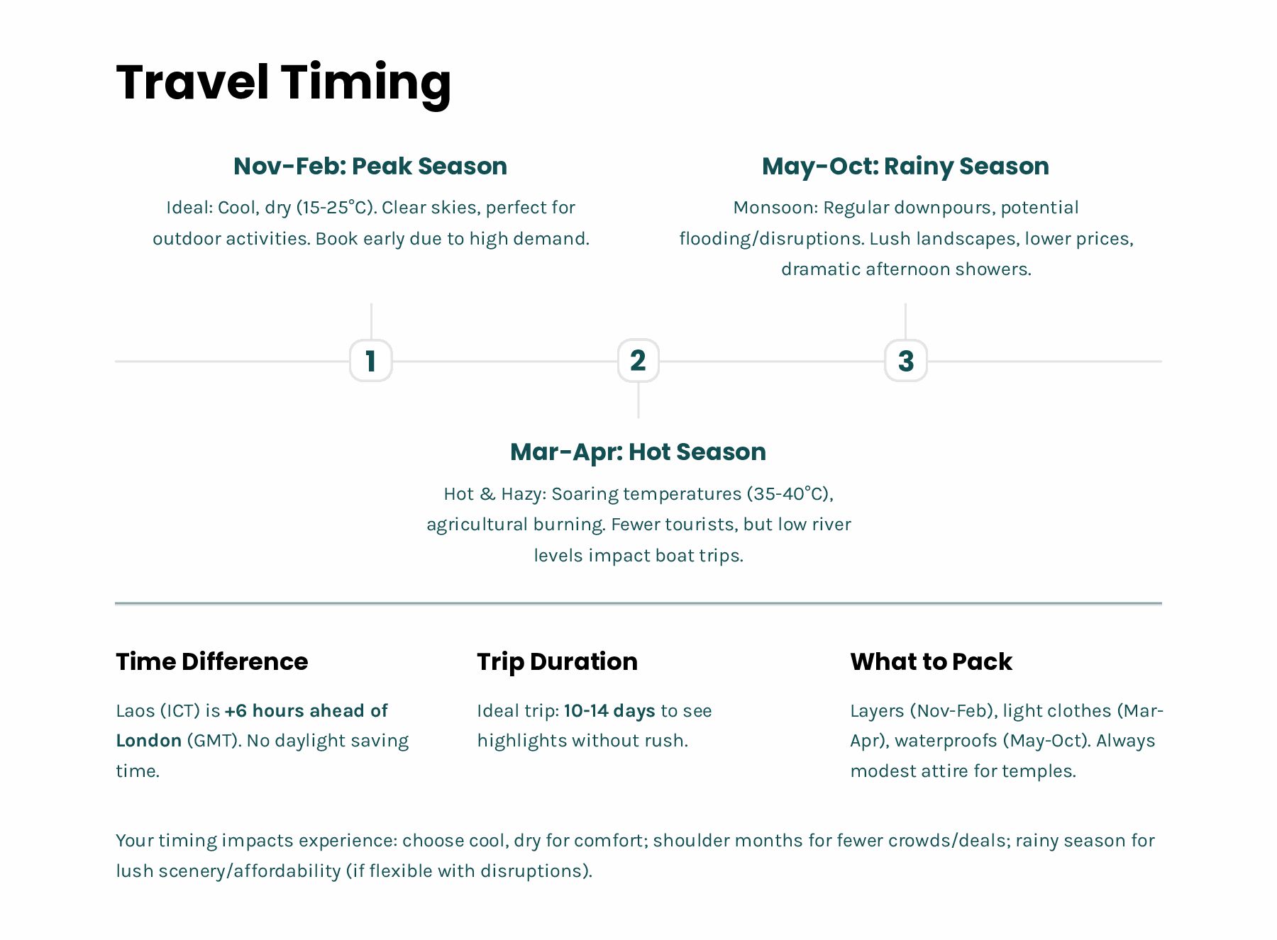 Travel Timing – Best seasons to visit, what to pack, trip length recommendations, and weather tips for each travel season.