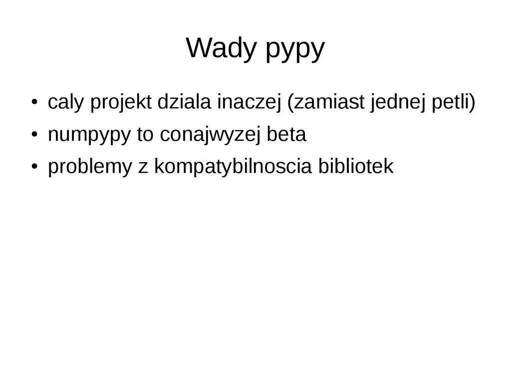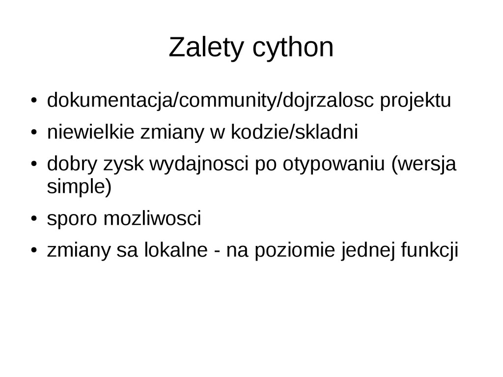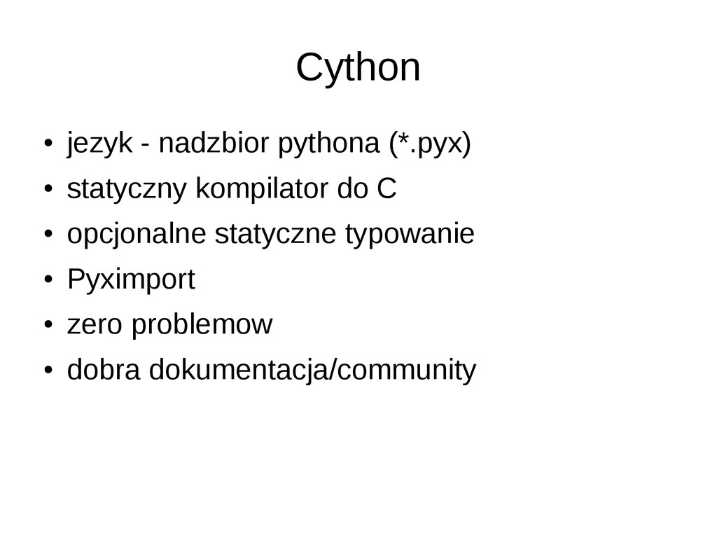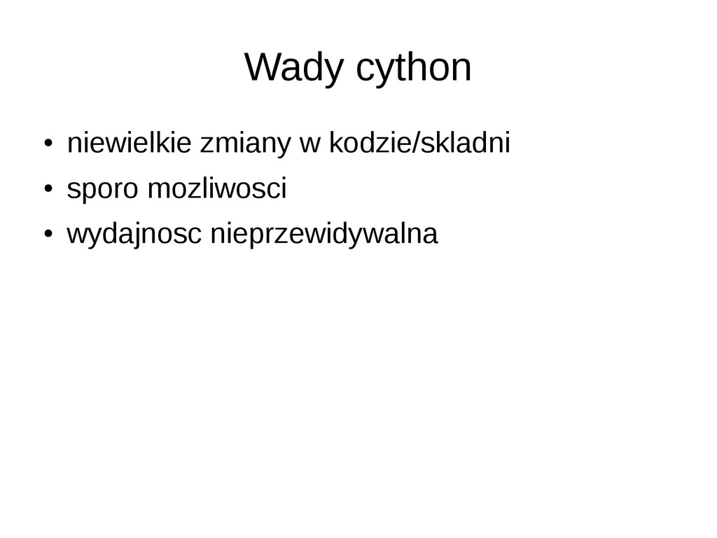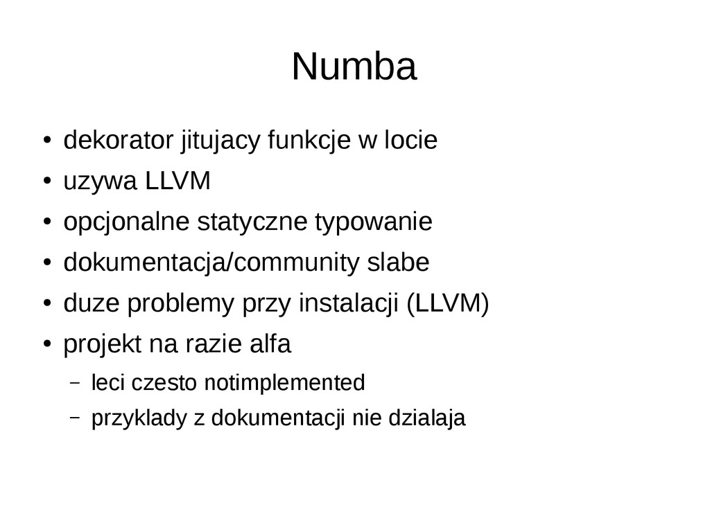 • opcjonalne statyczne typowanie • dokumentacja/community slabe • duze problemy przy instalacji (LLVM) • projekt na razie alfa – leci czesto notimplemented – przyklady z dokumentacji nie dzialaja