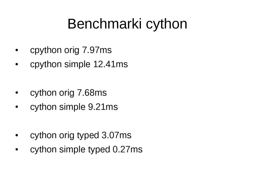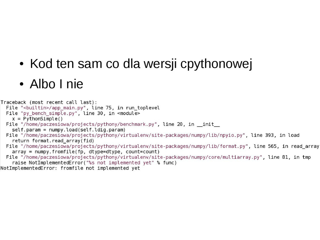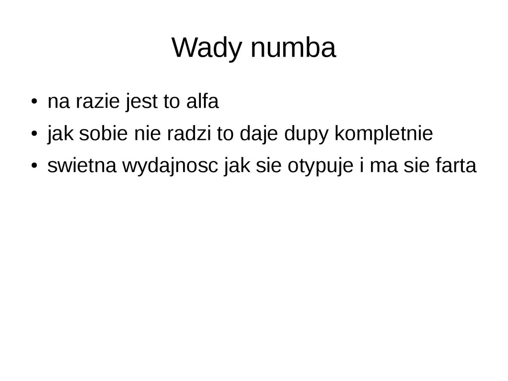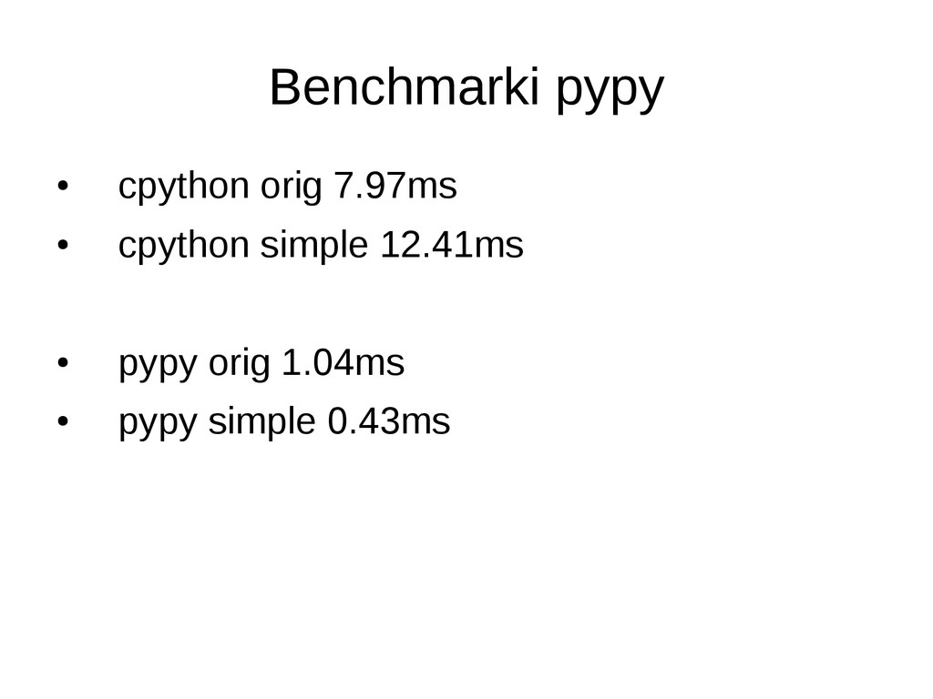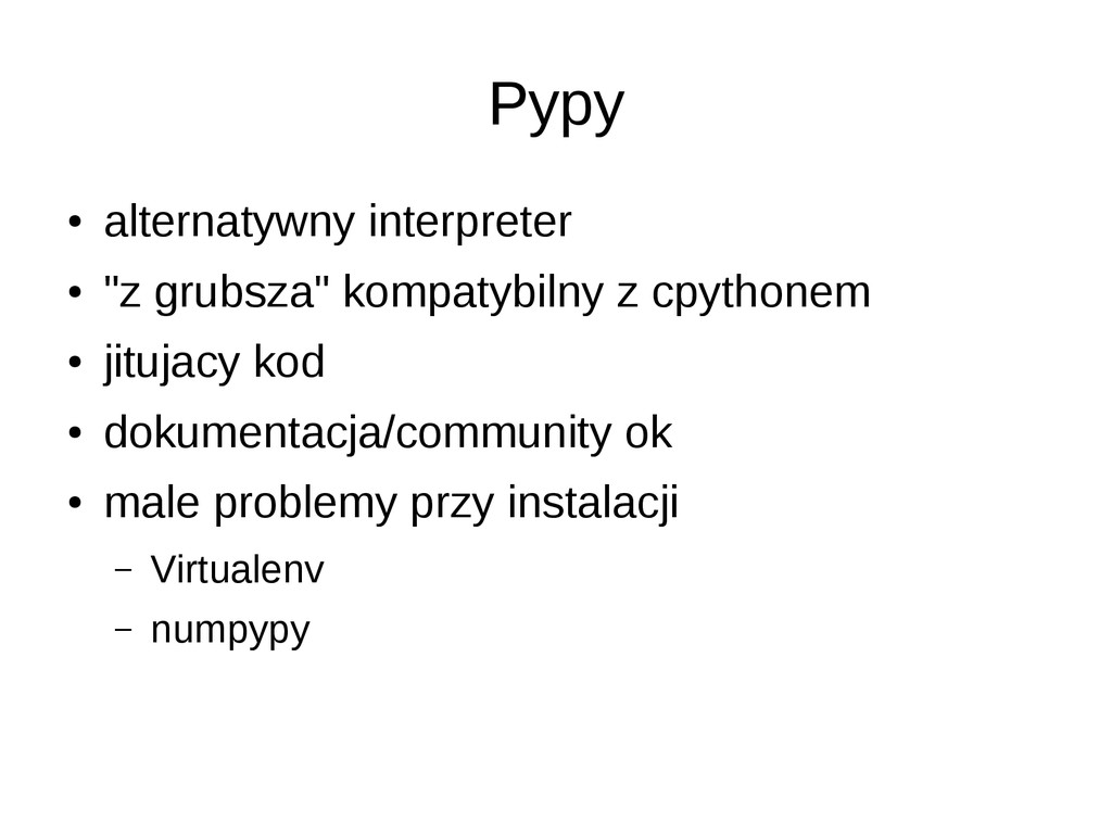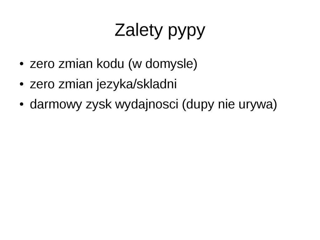 • opcjonalne statyczne typowanie • dokumentacja/community slabe • duze problemy przy instalacji (LLVM) • projekt na razie alfa – leci czesto notimplemented – przyklady z dokumentacji nie dzialaja