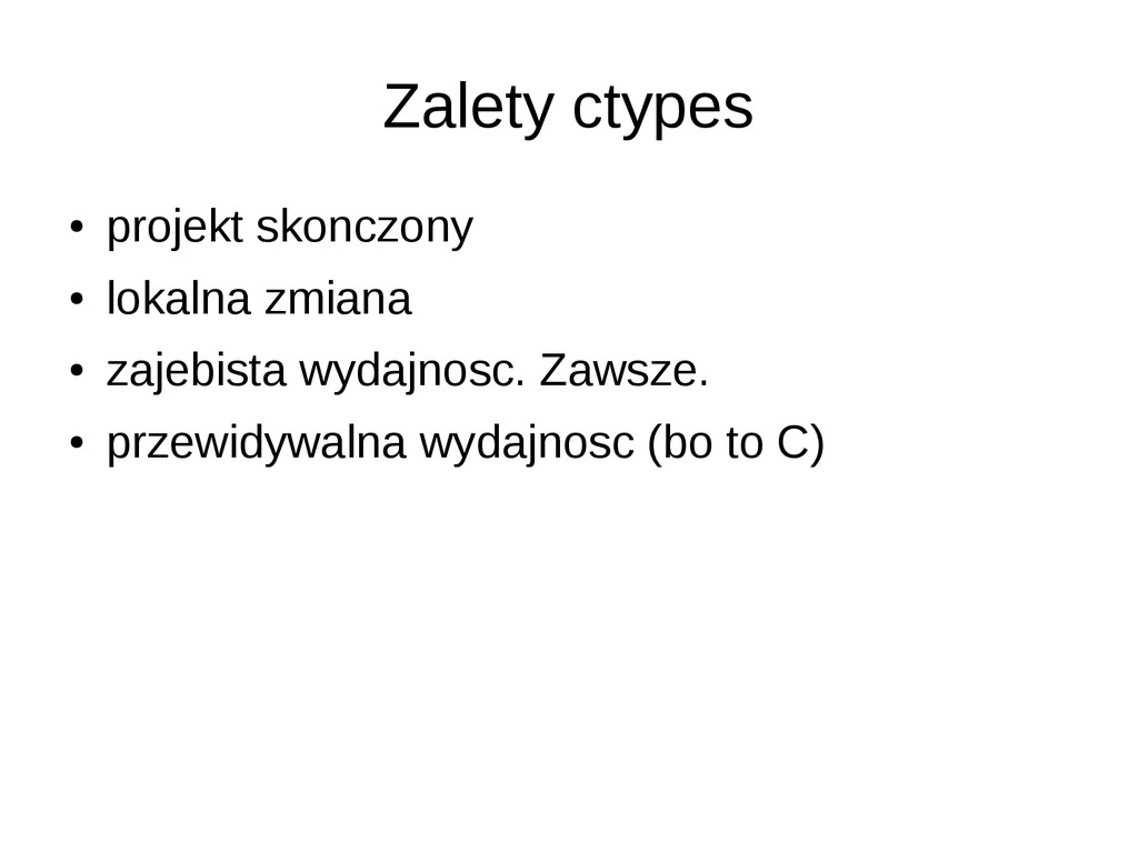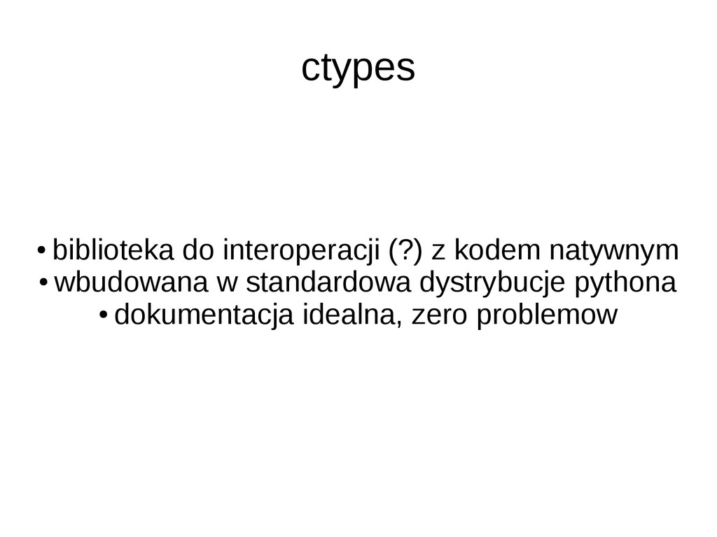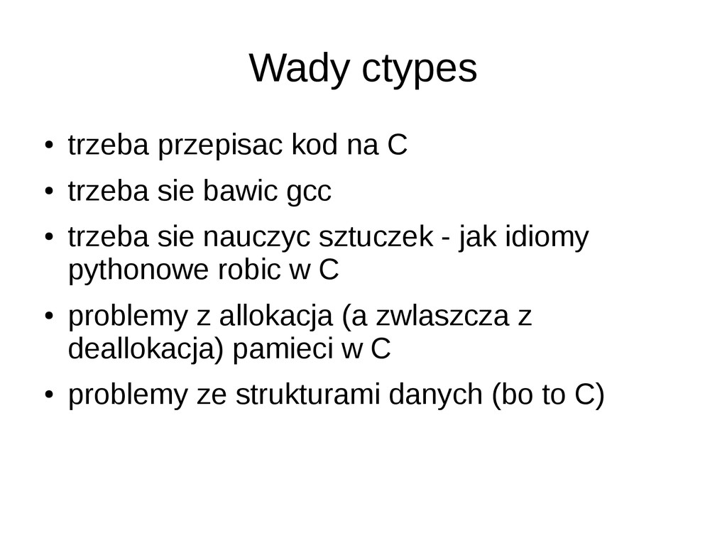 sie bawic gcc • trzeba sie nauczyc sztuczek - jak idiomy pythonowe robic w C • problemy z allokacja (a zwlaszcza z deallokacja) pamieci w C • problemy ze strukturami danych (bo to C)