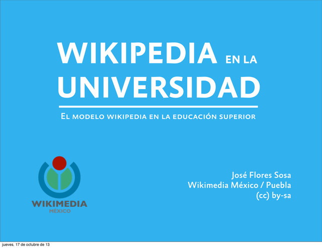 algunos profesores hagan pruebas individuales, es mucho más fácil que una universidad haga una apuesta más ambiciosa para implementar el programa de Wikipedia. las instituciones forman lazos importantes Una institución puede participar además con digitalización de acervo, actividades como editatones o clubes de wikipedistas, o hasta un convenio con el capítulo local de la Fundación Wikimedia. jueves, 17 de octubre de 13