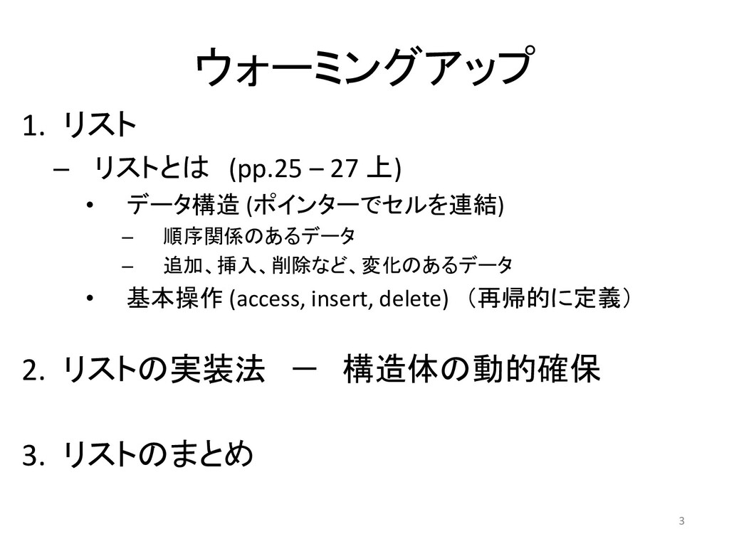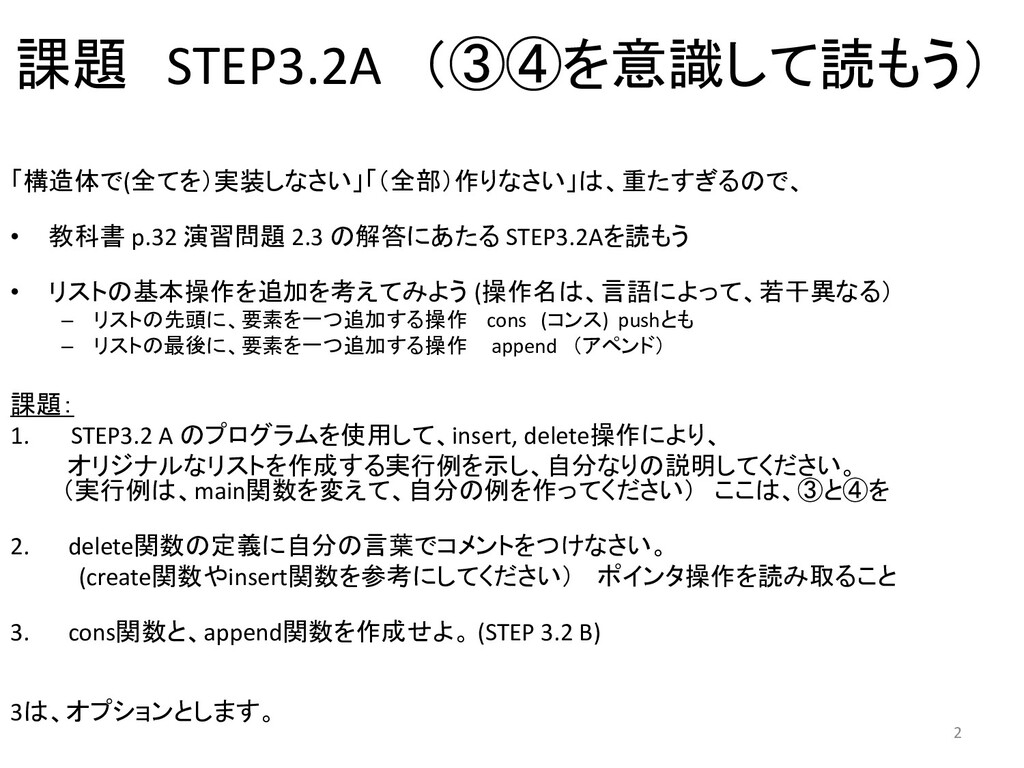 STEP3.2A䜢ㄞ䜒䛖 • 䝸䝇䝖䛾ᇶᮏ᧯స䜢㏣ຍ䜢⪃䛘䛶䜏䜘䛖 (᧯సྡ䛿䚸ゝㄒ䛻䜘䛳䛶䚸ⱝᖸ␗䛺䜛䠅 – 䝸䝇䝖䛾ඛ㢌䛻䚸せ⣲䜢୍䛴㏣ຍ䛩䜛᧯స cons (䝁䞁䝇) push䛸䜒 – 䝸䝇䝖䛾᭱ᚋ䛻䚸せ⣲䜢୍䛴㏣ຍ䛩䜛᧯స append 䠄䜰䝨䞁䝗䠅 ㄢ㢟䠖 1. STEP3.2 A 䛾䝥䝻䜾䝷䝮䜢⏝䛧䛶䚸insert, delete᧯స䛻䜘䜚䚸 䜸䝸䝆䝘䝹䛺䝸䝇䝖䜢సᡂ䛩䜛ᐇ⾜䜢♧䛧䚸⮬ศ䛺䜚䛾ㄝ᫂䛧䛶䛟䛰䛥䛔䚹 䠄ᐇ⾜䛿䚸main㛵ᩘ䜢ኚ䛘䛶䚸⮬ศ䛾䜢స䛳䛶䛟䛰䛥䛔䠅 䛣䛣䛿䚸䐡䛸䐢䜢 2. delete㛵ᩘ䛾ᐃ⩏䛻⮬ศ䛾ゝⴥ䛷䝁䝯䞁䝖䜢䛴䛡䛺䛥䛔䚹 (create㛵ᩘ䜔insert㛵ᩘ䜢ཧ⪃䛻䛧䛶䛟䛰䛥䛔䠅 䝫䜲䞁䝍᧯స䜢ㄞ䜏ྲྀ䜛䛣䛸 3. cons㛵ᩘ䛸䚸append㛵ᩘ䜢సᡂ䛫䜘䚹 (STEP 3.2 B) 3䛿䚸䜸䝥䝅䝵䞁䛸䛧䜎䛩䚹 2