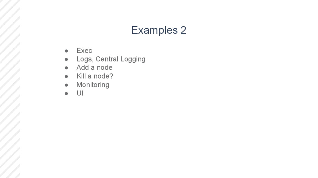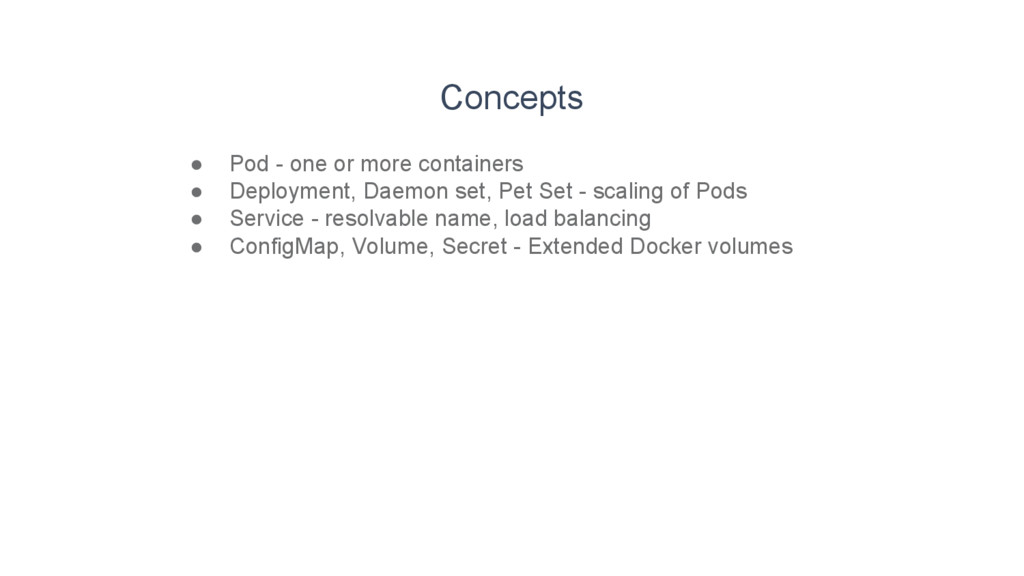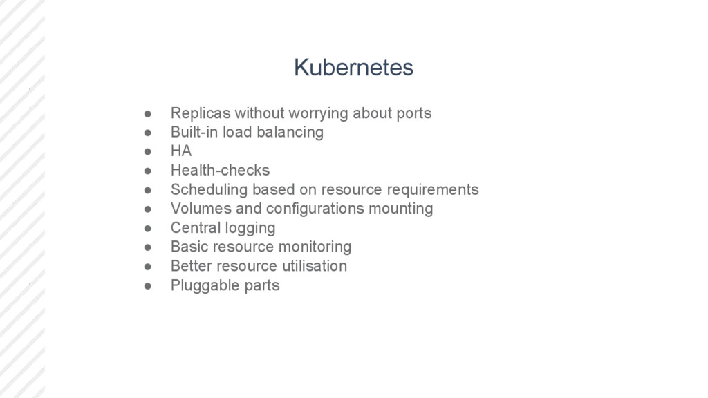 balancing • HA • Health-checks • Scheduling based on resource requirements • Volumes and configurations mounting • Central logging • Basic resource monitoring • Better resource utilisation • Pluggable parts