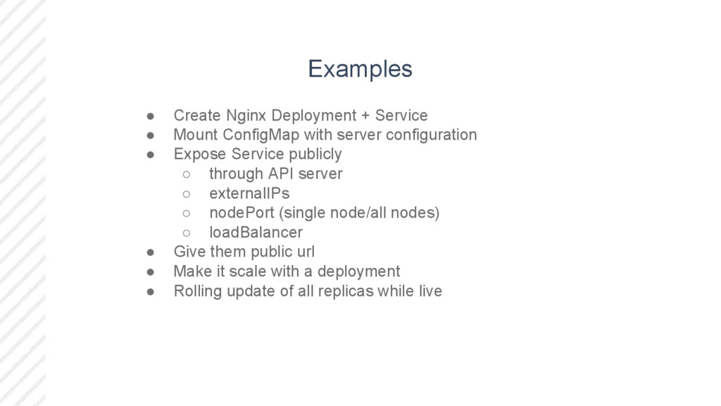 with server configuration • Expose Service publicly ◦ through API server ◦ externalIPs ◦ nodePort (single node/all nodes) ◦ loadBalancer • Give them public url • Make it scale with a deployment • Rolling update of all replicas while live