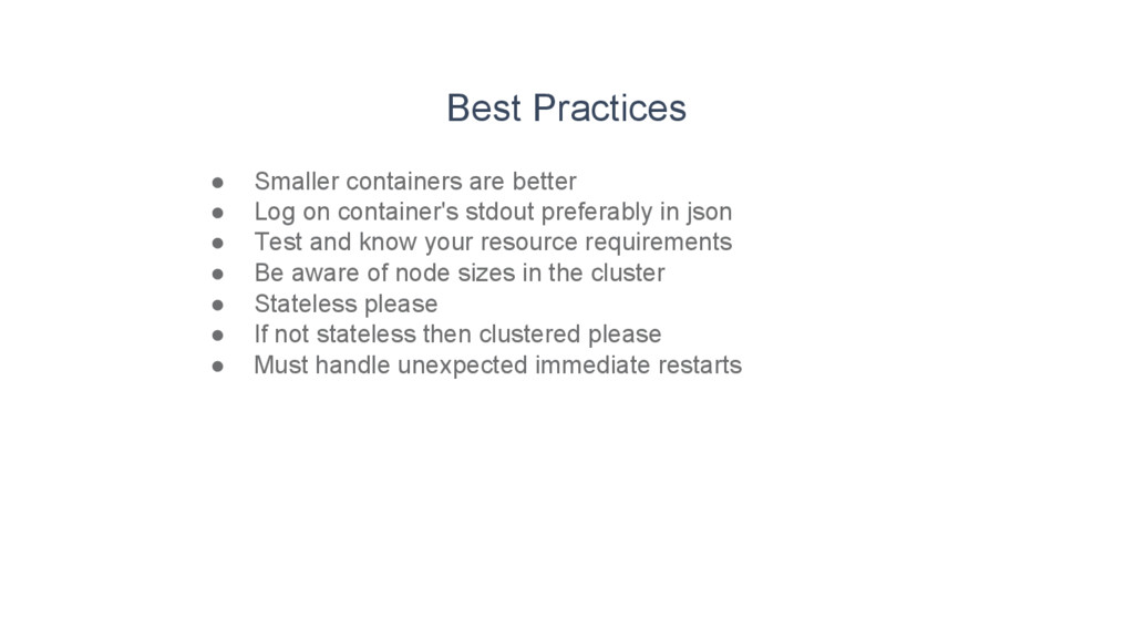 container's stdout preferably in json • Test and know your resource requirements • Be aware of node sizes in the cluster • Stateless please • If not stateless then clustered please • Must handle unexpected immediate restarts