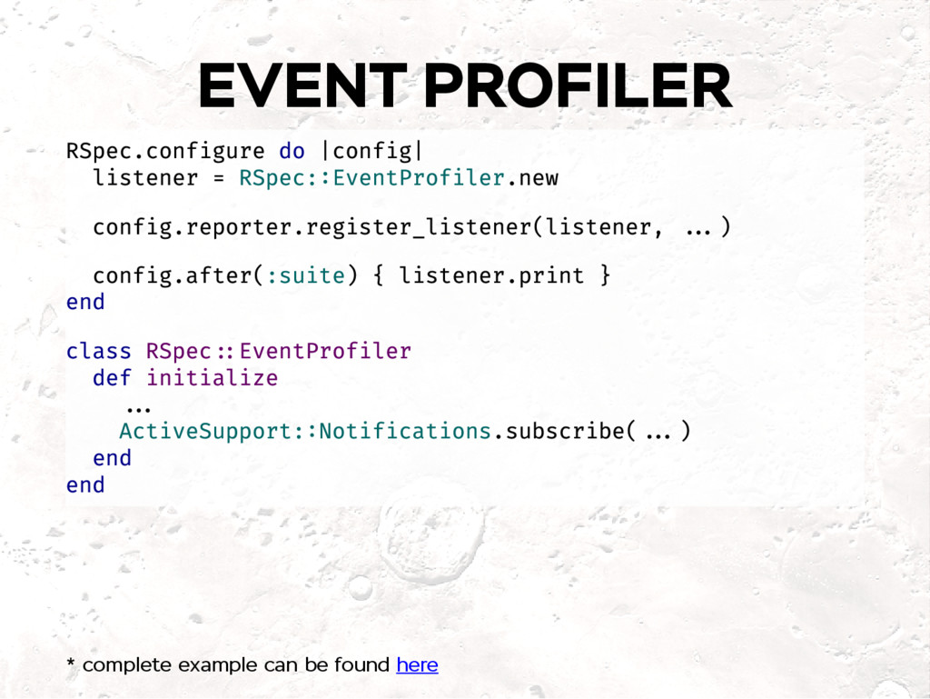 EventProfiler: https://gist.github.com/palkan/875e90fd085e214ce3b0f76e2b27208f