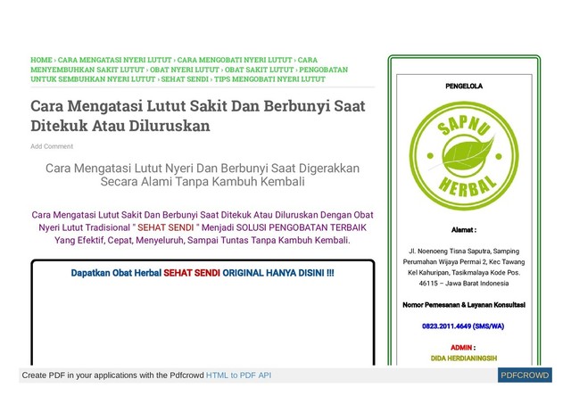 keseluruhan sendi lutut. Cedera, misalnya cedera pada tulang rawan dan kerusakan tendon atau ligamen. Penyakit tertentu, seperti osteoartritis, penyakit asam urat, atau tendonitis. Perdarahan pada sendi. Infeksi, misalnya artritis septik. Kelebihan berat badan atau obesitas. Dan karena alasan itulah, mengapa kami disini hadir memberikan SOLUSI TERBAIK kepada anda untuk mengatasi gangguan lutut sakit dan berbunyi saat digerakan dengan Cara Mengatasi Lutut Sakit Dan Berbunyi Saat Ditekuk Atau Diluruskan secara alami dengan mengkonsumsi " SEHAT SENDI ", hal ini karena khasiat maupun kandungan manfaat di dalamnya telah TERUJI tidak hanya secara klinis saja, namun juga TERBUKTI secara nyata. Apa Sebenanrnya Sehat Sendi Ini, Sehingga Sangat Efektif Mengatasi Sakit Lutut Dan Berbunyi Saat Digerakan ?? Berikut Ini Penjelasan Selengkapanya ! Dan Inilah SEHAT SENDI (MS-WSD) Sebagai Cara Mengatasi Lutut Sakit Dan Berbunyi Saat Ditekuk Atau Diluruskan Secara Alami Sampai Tuntas Tanpa Efeksamping Create PDF in your applications with the Pdfcrowd HTML to PDF API PDFCROWD