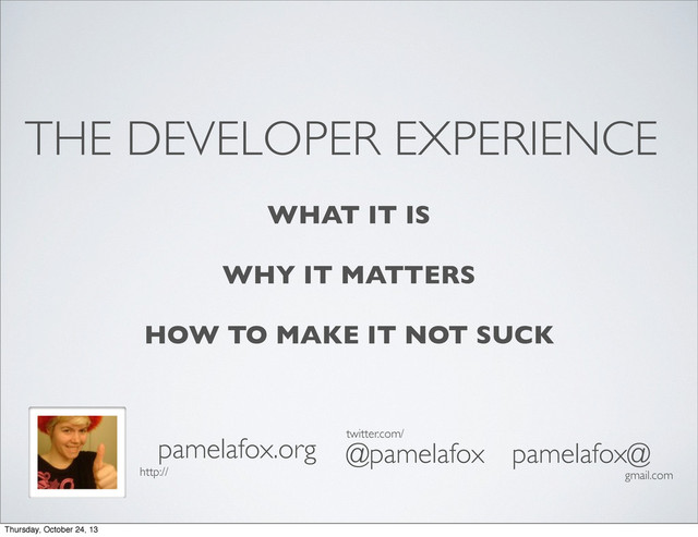positive and negative, between a developer and a library, tool, or API.” Developer Experience (Library, Tool, API, ...) PROVIDER CONSUMER Thursday, October 24, 13