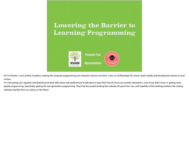 Hi! I’m Pamela. I work at Khan Academy, creating the computer programming and computer science curriculum. I also run GirlDevelopIt SF, where I teach weekly web development classes to local women. I’m interrupting your regularly scheduled back-to-back talks about web performance to talk about a topic that I bet all of you are secretly interested in, even if you didn’t know it: getting more people programming. Specifically, getting the next generation programming. They’ll be the people building fast websites 20 years from now, and hopefully will be tackling problems like making websites load fast from our colony on the Moon!