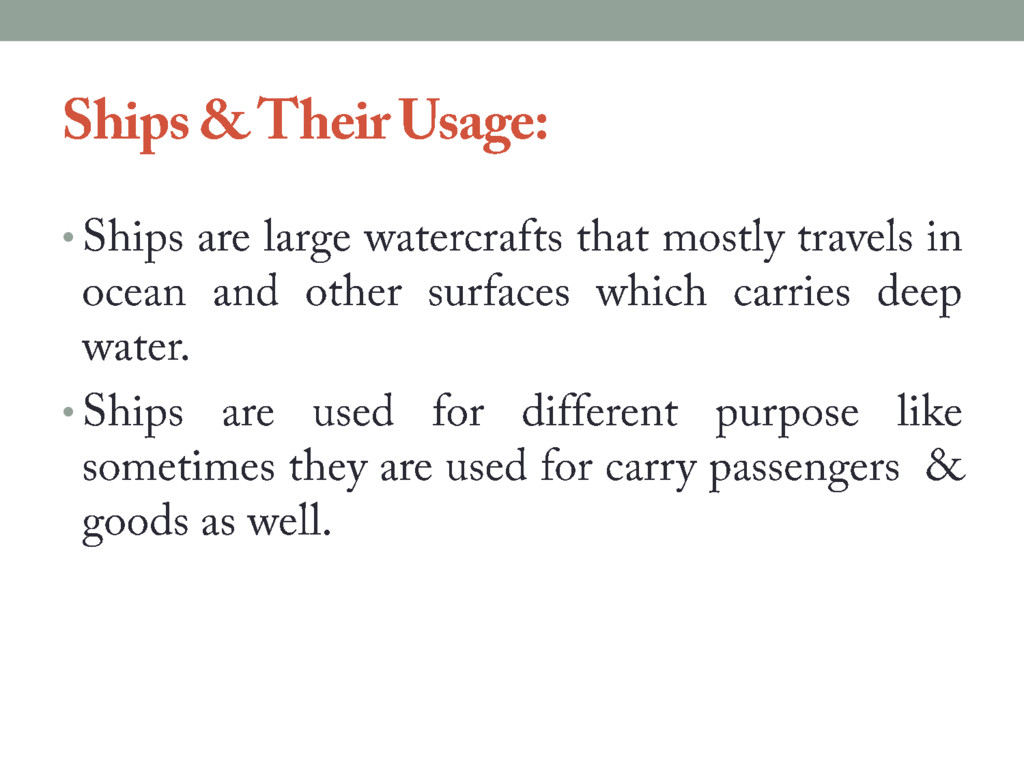 Ships are used for different purposes.They are used to travel people and goods from one places to another.
