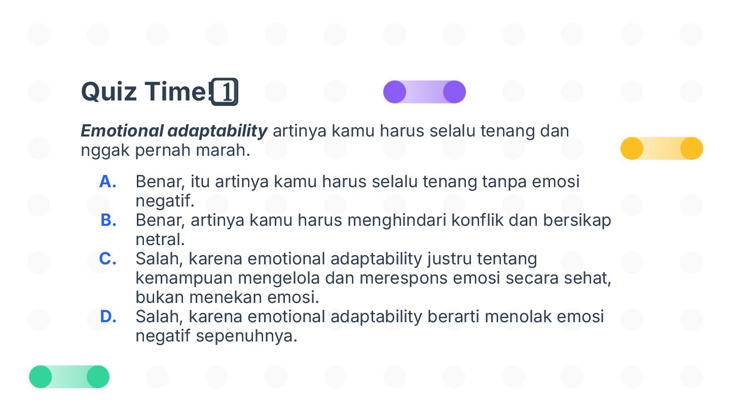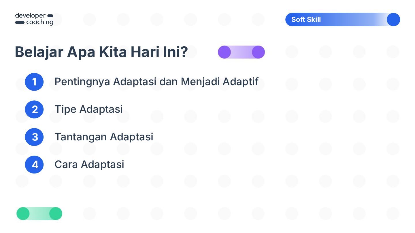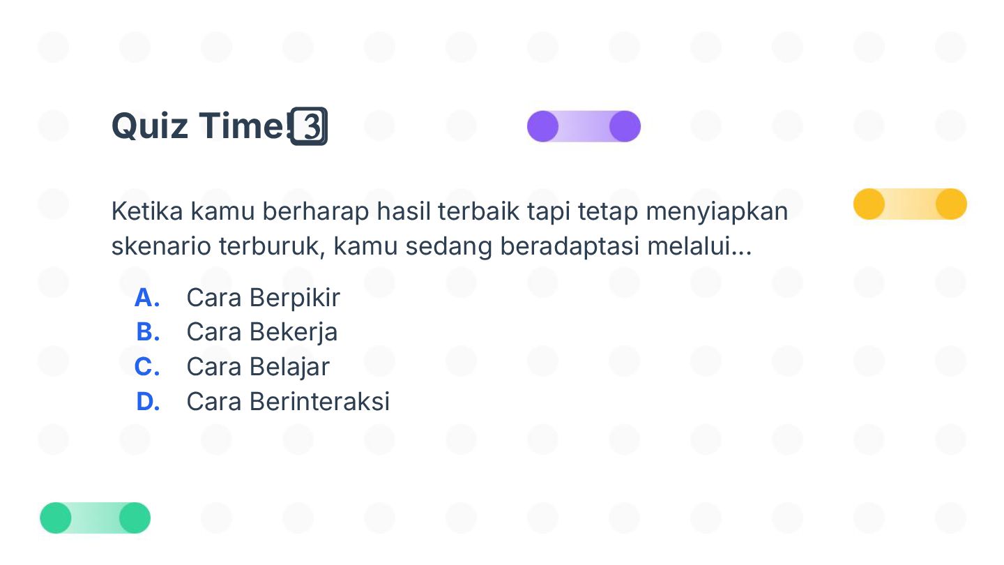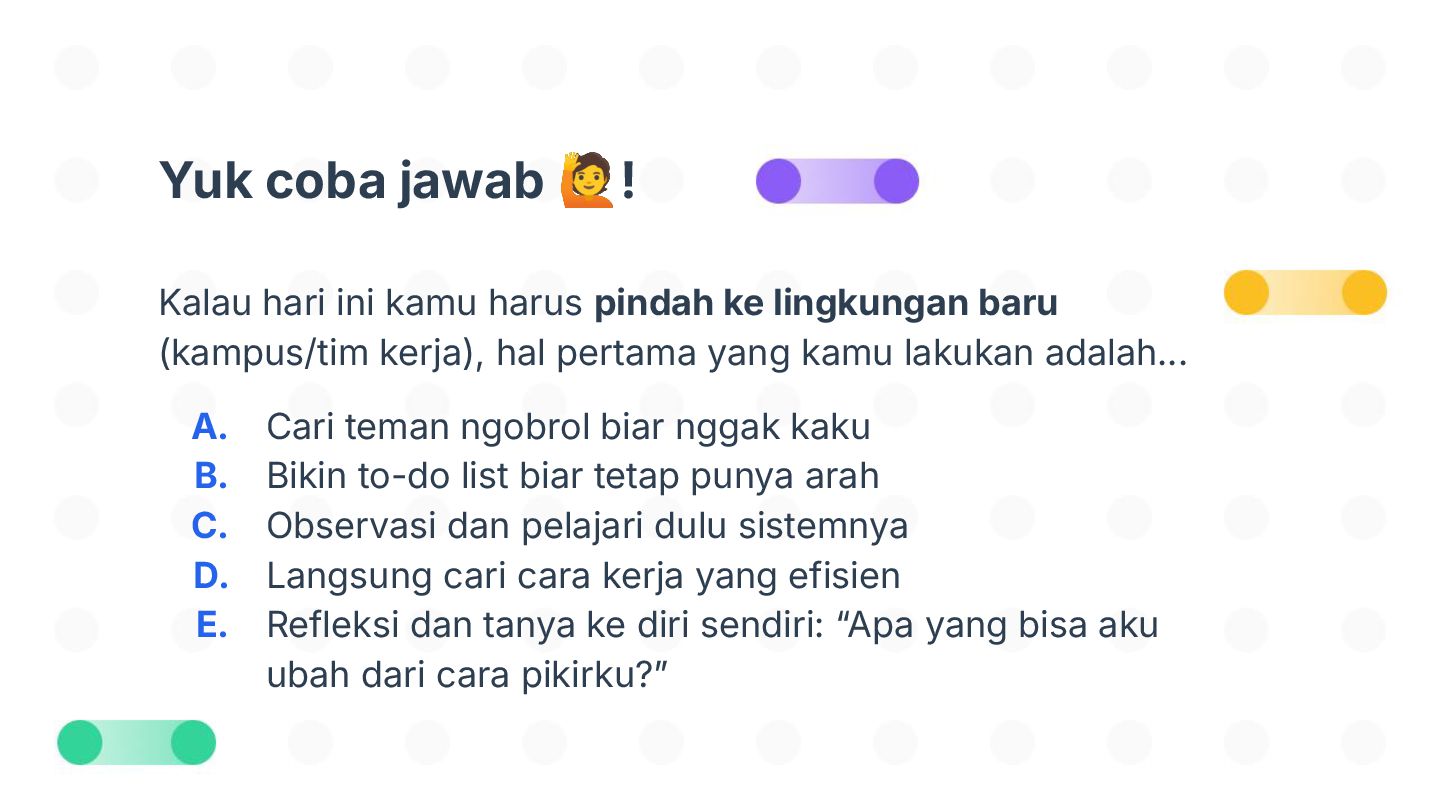 Perubahan bisa datang tiba-tiba—dan tidak selalu kita minta. Tapi tahukah kamu, kemampuan beradaptasi justru jadi salah satu kunci bertahan dan tumbuh di dunia yang cepat berubah? Dalam sesi Adaptasi Bukan Pilihan, Tapi Kunci untuk Berkembang!, kita akan mengupas kenapa adaptasi itu penting, mengenali tantangan-tantangan dalam prosesnya, dan menemukan cara beradaptasi yang bisa kamu latih sejak hari ini. Bukan hanya untuk bertahan, tapi juga untuk berkembang.