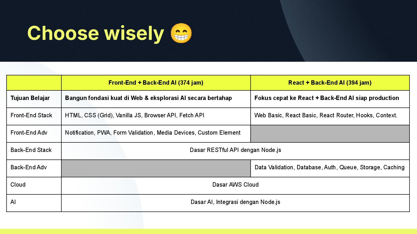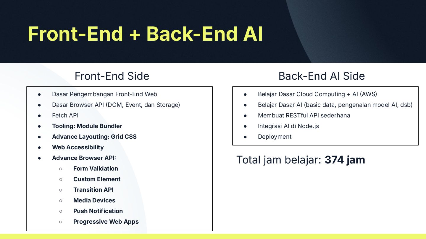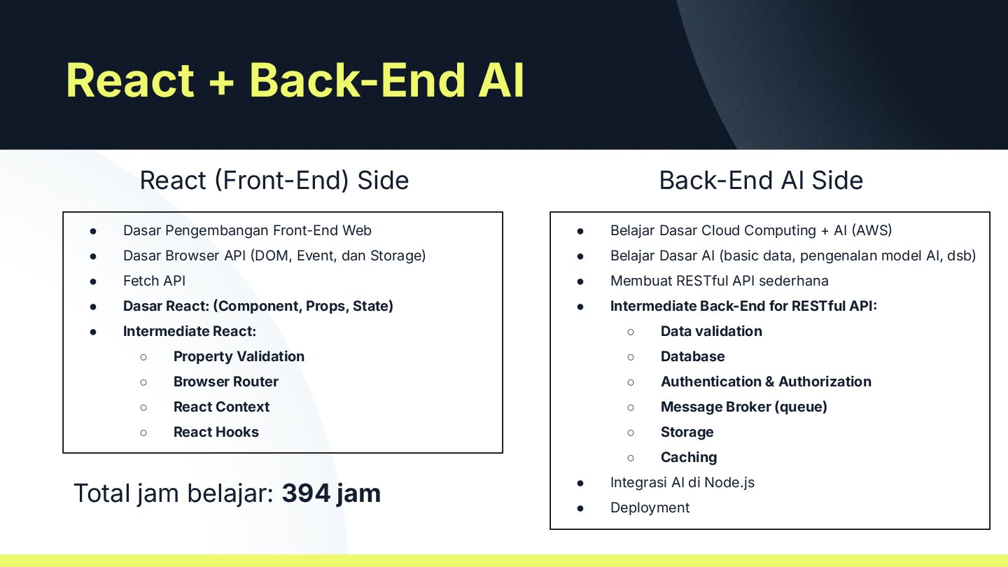 + Back-End AI (394 jam) Tujuan Belajar Bangun fondasi kuat di Web & eksplorasi AI secara bertahap Fokus cepat ke React + Back-End AI siap production Front-End Stack HTML, CSS (Grid), Vanilla JS, Browser API, Fetch API Web Basic, React Basic, React Router, Hooks, Context. Front-End Adv Notification, PWA, Form Validation, Media Devices, Custom Element Back-End Stack Dasar RESTful API dengan Node.js Back-End Adv Data Validation, Database, Auth, Queue, Storage, Caching Cloud Dasar AWS Cloud AI Dasar AI, Integrasi dengan Node.js