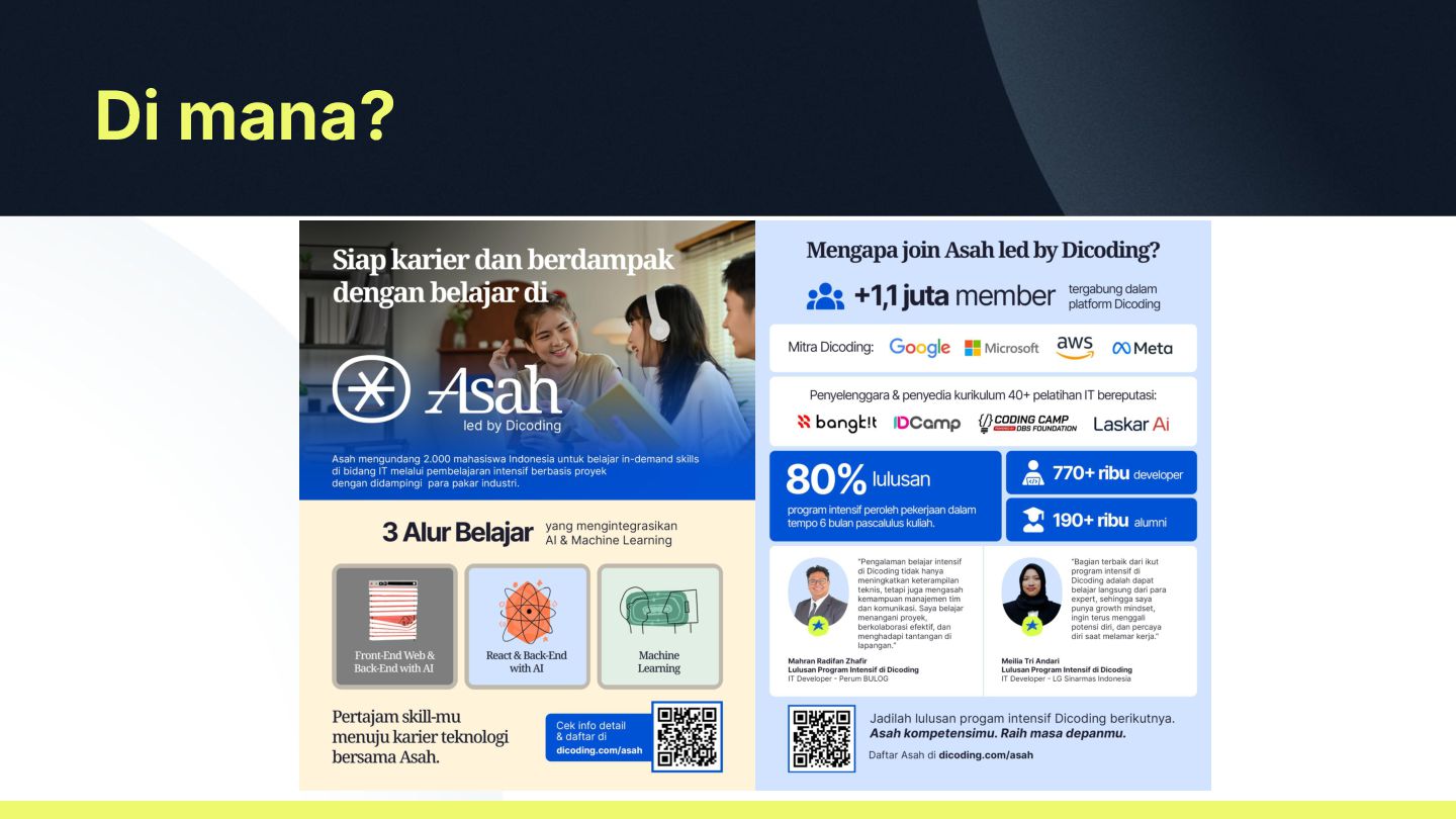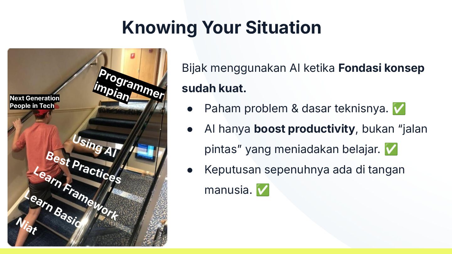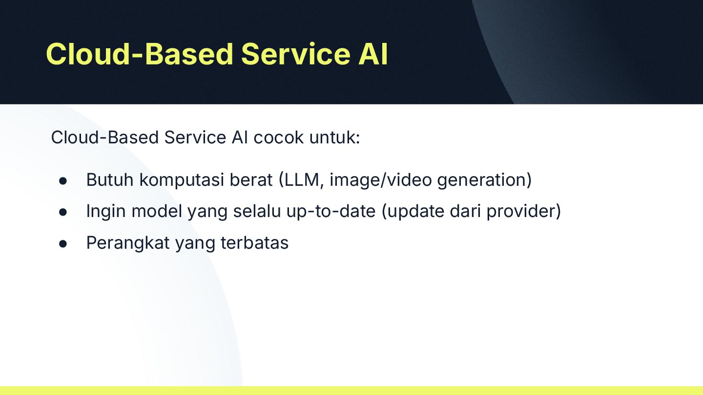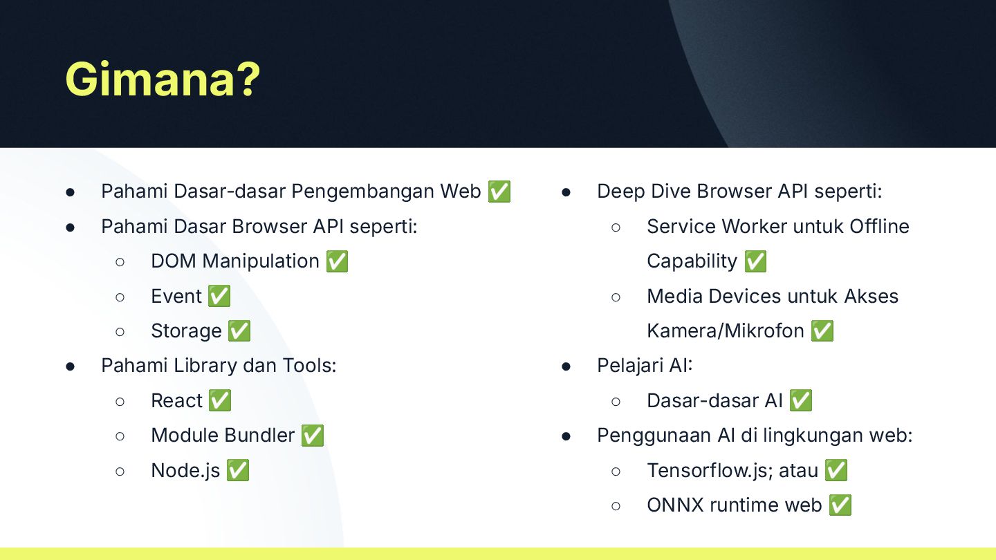 + Back-End AI (394 jam) Tujuan Belajar Bangun fondasi kuat di Web & eksplorasi AI secara bertahap Fokus cepat ke React + Back-End AI siap production Front-End Stack HTML, CSS (Grid), Vanilla JS, Browser API, Fetch API Web Basic, React Basic, React Router, Hooks, Context. Front-End Adv Notification, PWA, Form Validation, Media Devices, Custom Element Back-End Stack Dasar RESTful API dengan Node.js Back-End Adv Data Validation, Database, Auth, Queue, Storage, Caching Cloud Dasar AWS Cloud AI Dasar AI, Integrasi dengan Node.js