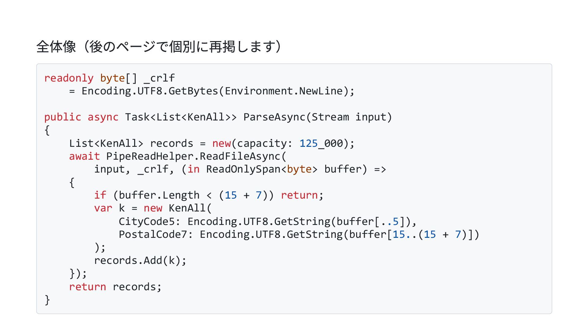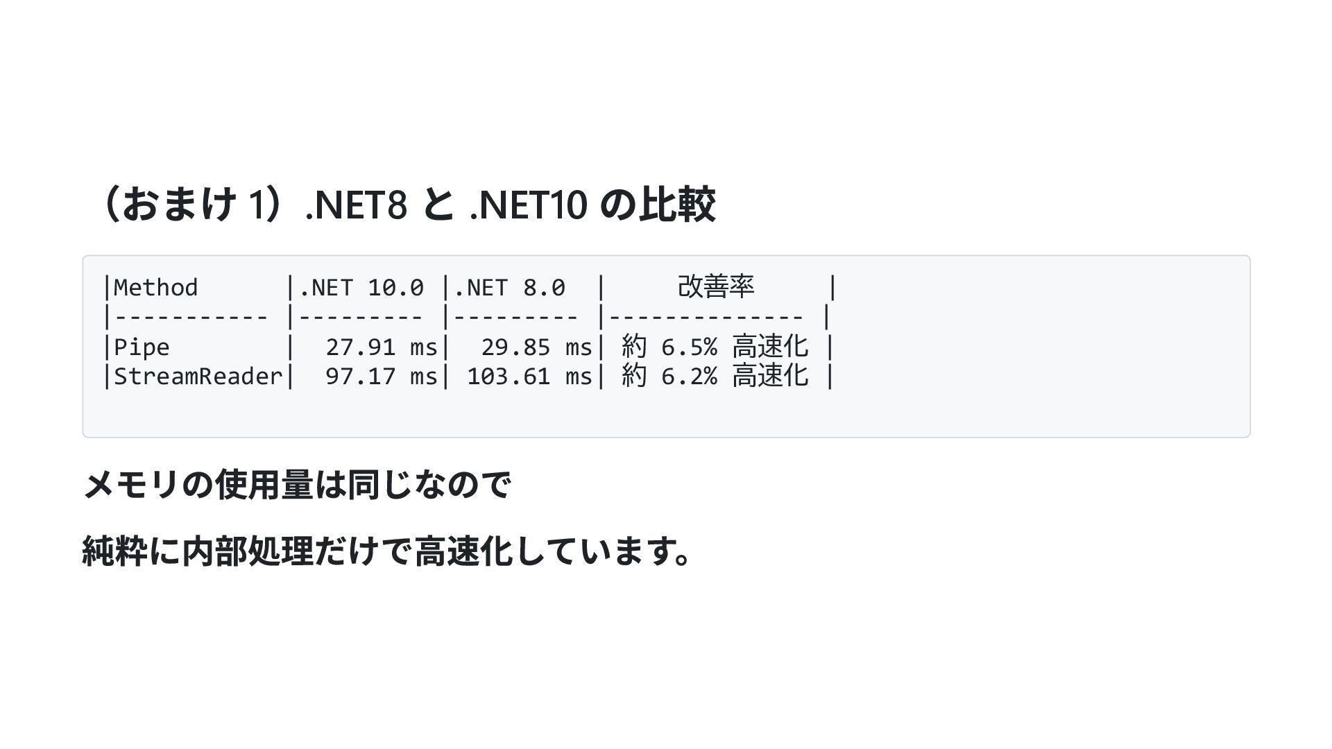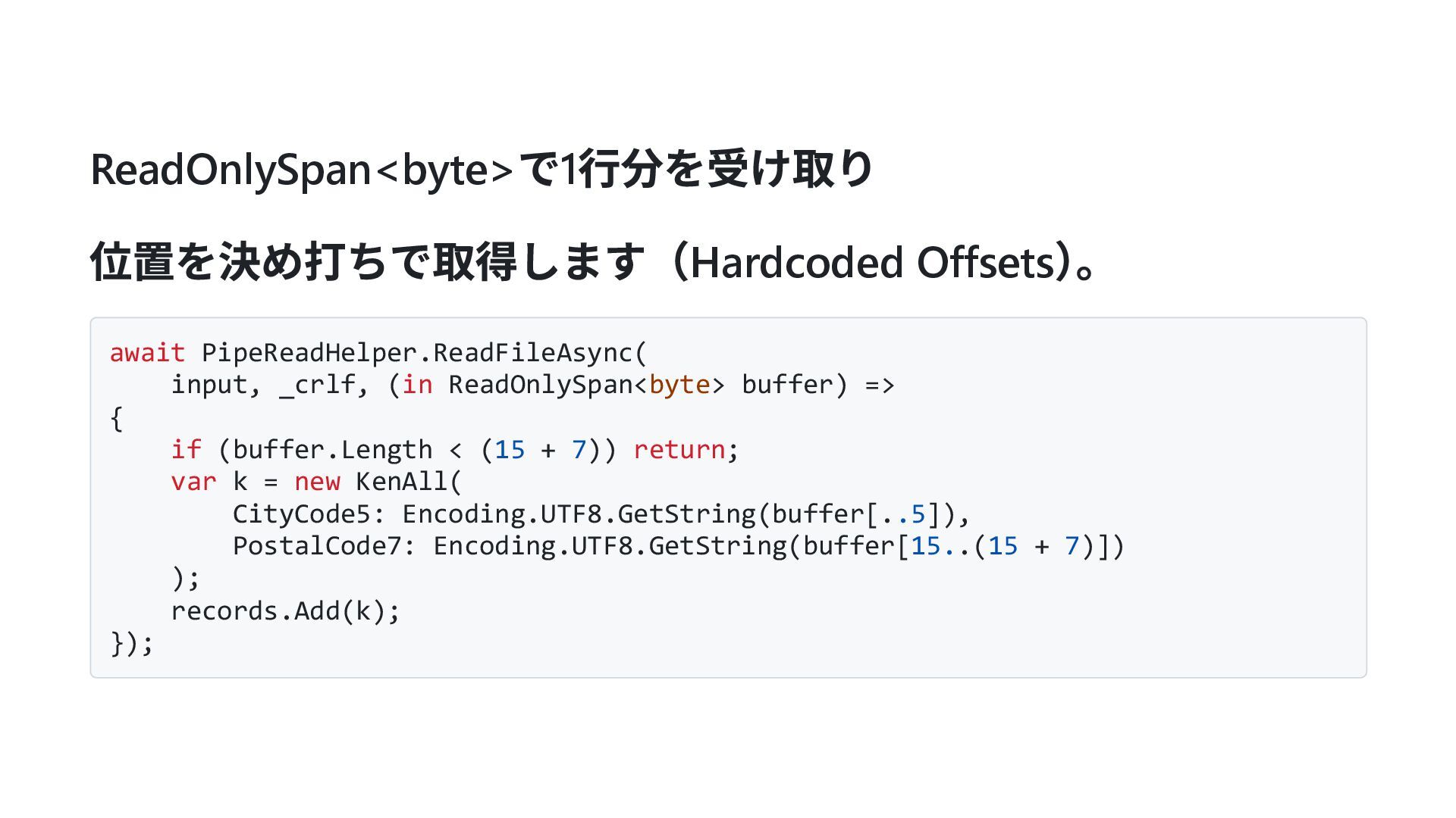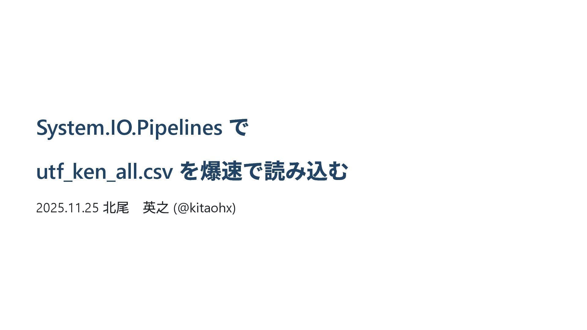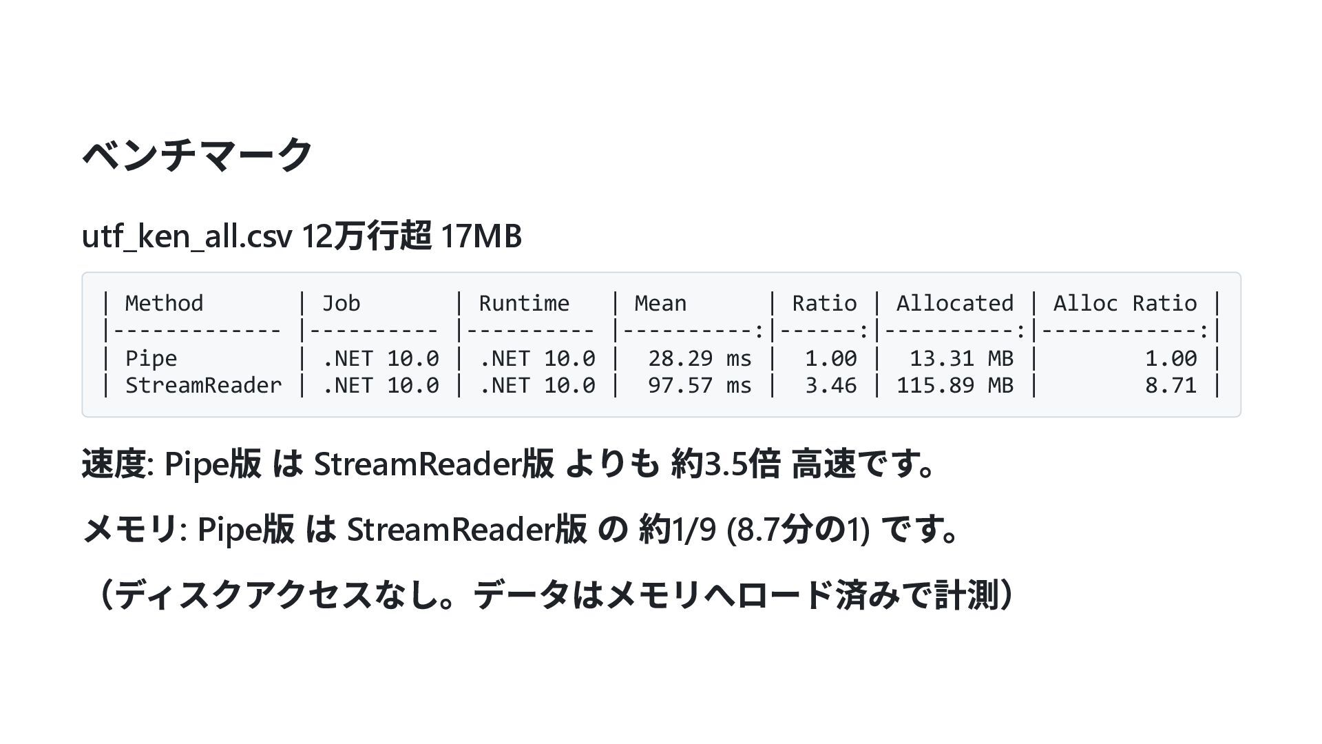 .NETの System.IO.Pipelines を使って、12万行超の郵便番号CSVを爆速で読み込む実験記録です。 「CSVを固定長として扱う」アプローチにより、StreamReader と比較して速度3.5倍、メモリ割り当て1/9を実現しました。 BenchmarkDotNetによる .NET 8 と .NET 10 の比較計測結果や、SequenceReader を使った具体的な実装テクニックも公開しています。